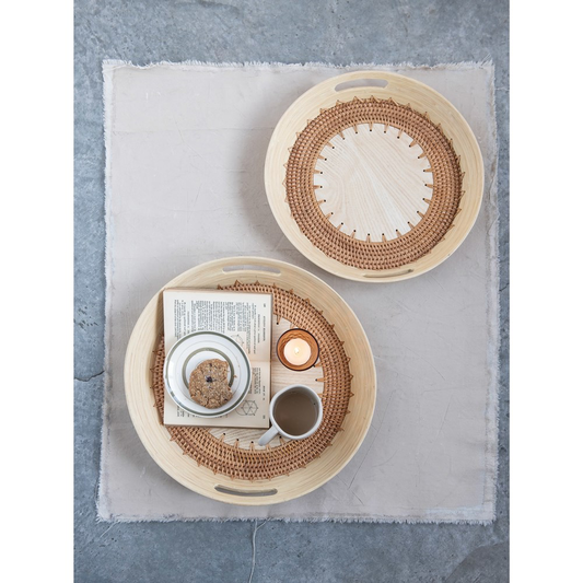 Decorative Hand-Woven Rattan & Oak Wood Veneer Trays