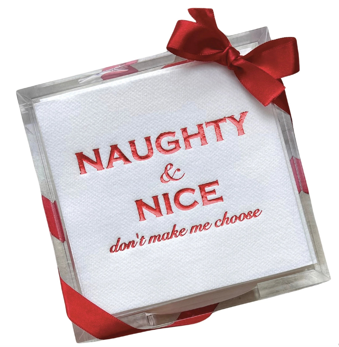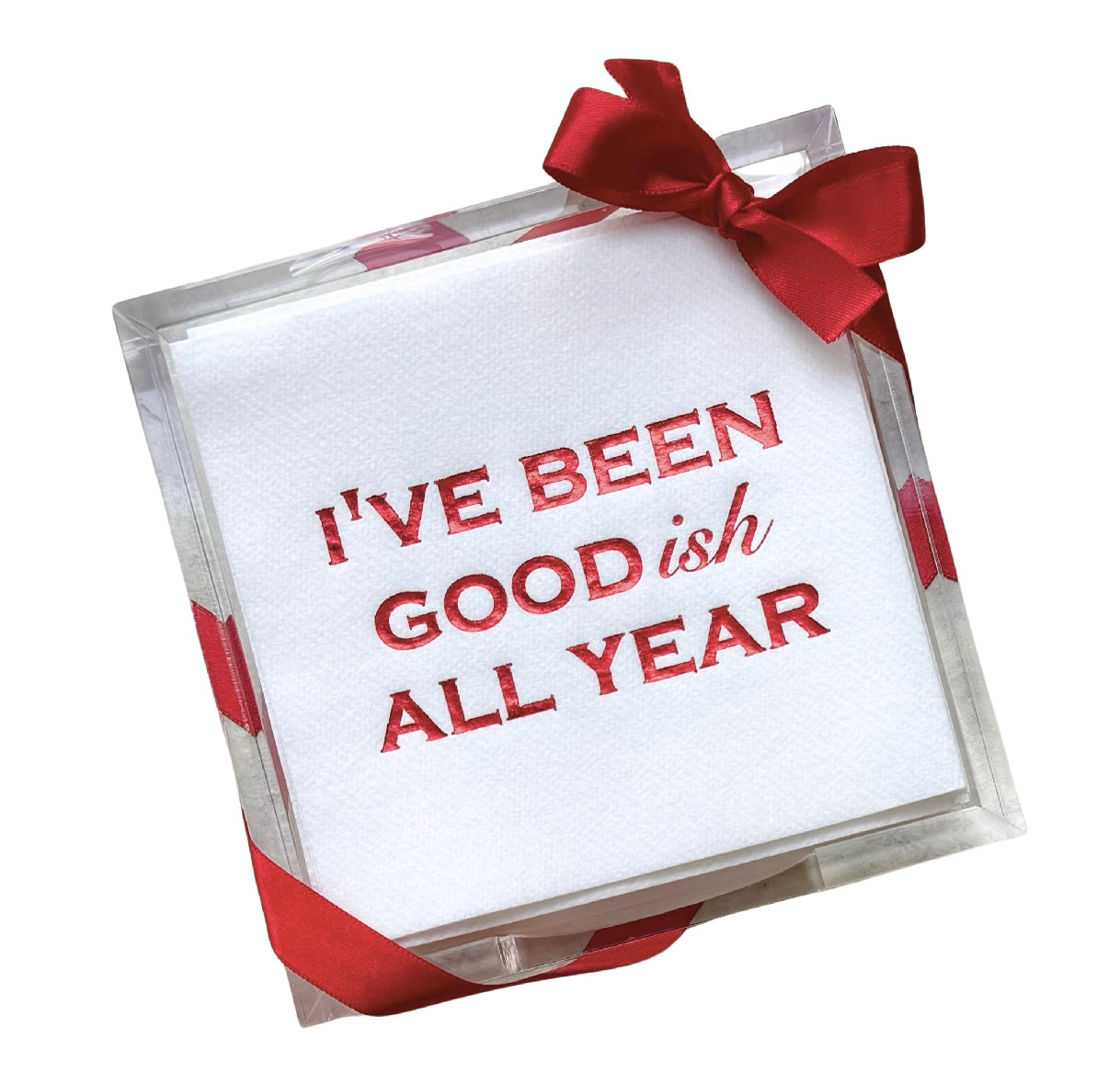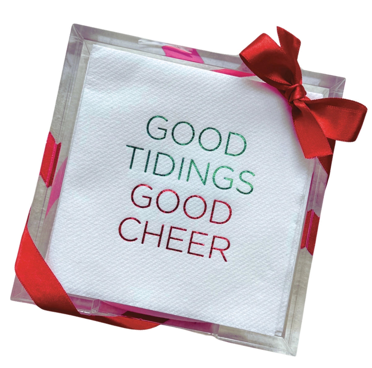 Our heavy-weight acrylic trays are both beautiful and functional. They have a unique cut-out on one side to add function to form. The crystal clear, 8mm thick acrylic has a nice heft and a clean look. Each tray contains 24 cloth-like disposable napkins with a foil embossed message that has a rich, letter-press effect that is several cuts above your average paper cocktail napkin. Elevate your hosting or bring this to your favorite hostess to add some chic style and fun.