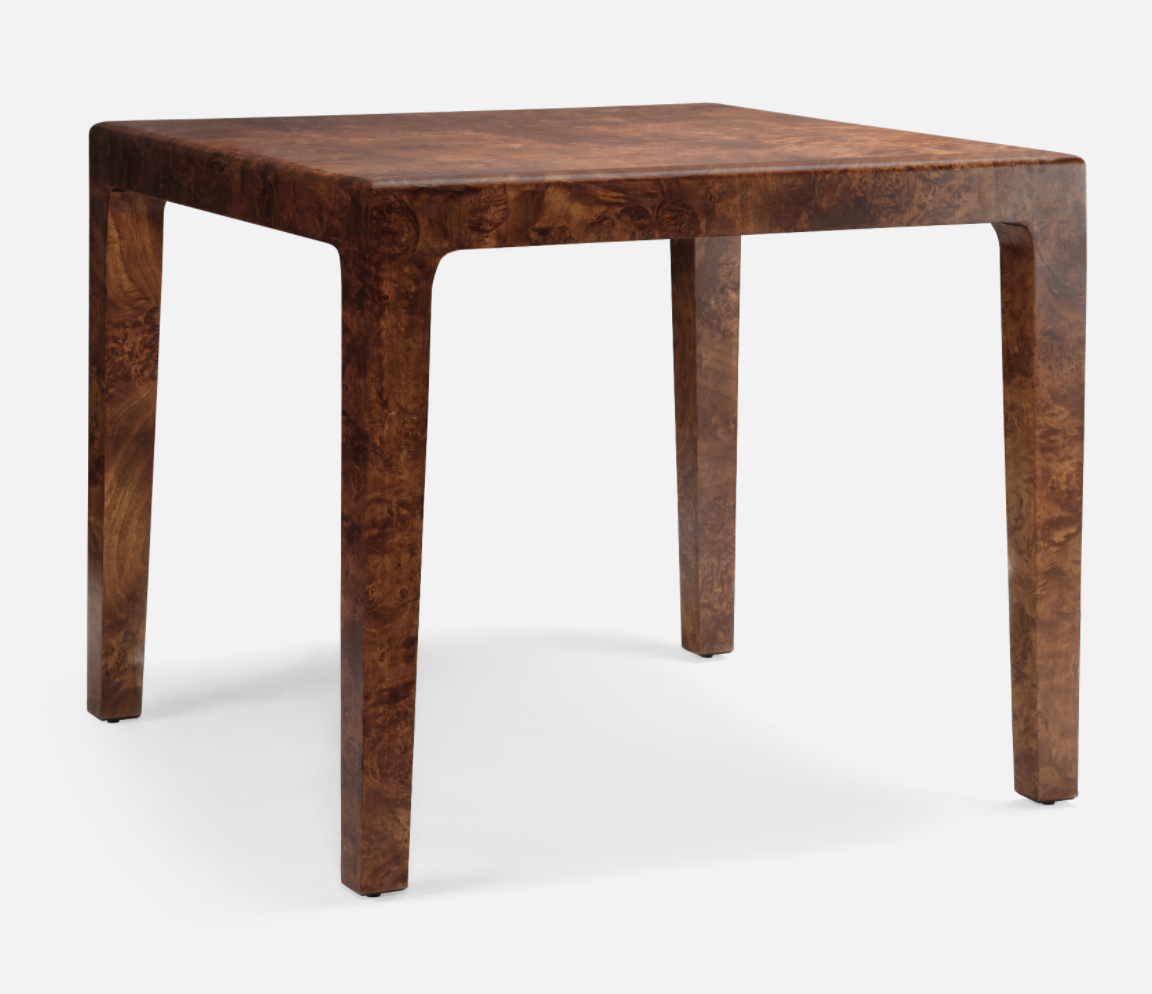 Swirling grain patterns abound in our Alexis, made from high contrast mappa burl. Given the nature of the material, each pattern differs per piece. Standing atop shapely tapered legs with clean modern lines, this game table adds a refined touch to any social affair.