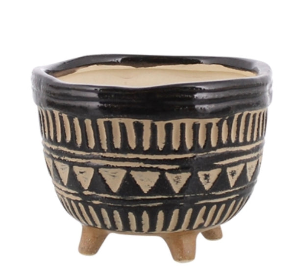 A terra cotta-esque finish with a hand painted debossed pattern lend an earthy and tribal impression to this dramatic footed ceramic bowl.