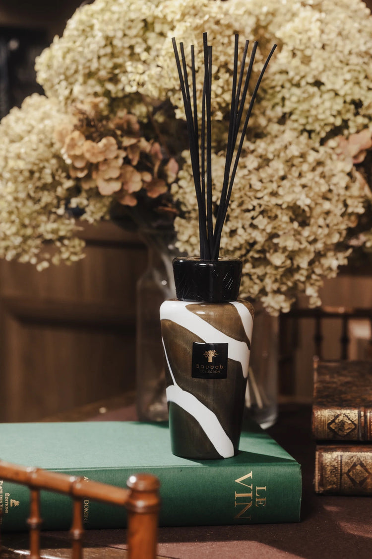 The 16.9 fl. oz | 500ml Agate perfume diffuser features the same sophisticated design as our larger editions, with a refined blend of grey-blue and khaki green. Inspired by the magic of Brazilian agate stones, its unique patterns give each piece a distinctive character. The glossy black cap completes the elegant look, while its delicate fragrance makes it both a stylish decorative object and a source of refinement for any interior.