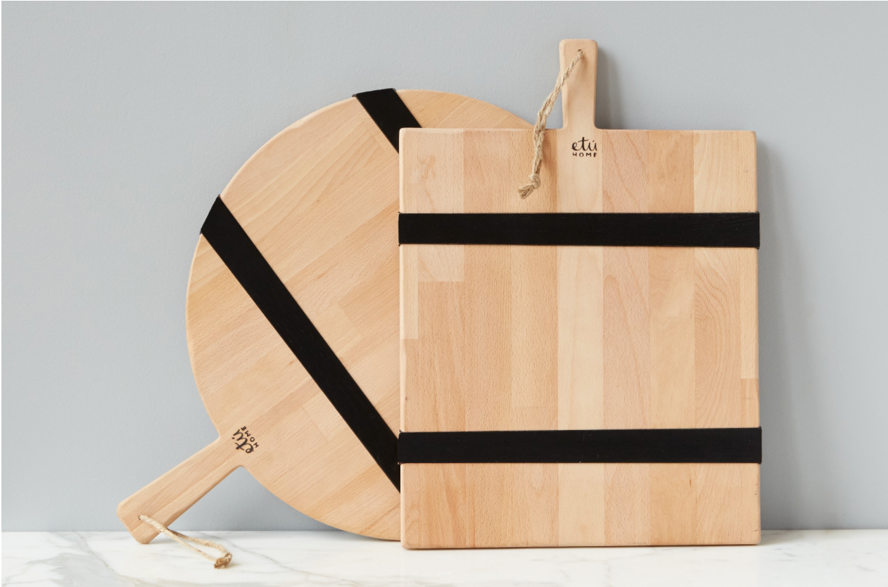 An even more functional and modern version of a signature pizza board, this charcuterie board is handcrafted from reclaimed beech and complimented by sleek black slats. The round wood board is made up of a smooth beech hardwood that is distinguished by two strips of oak timber to prevent warping of the reclaimed wood. Unlike a pine pizza board, the beech wooden pizza tray is not limited to decoration and can double as a cutting board. Ideal for use as a charcuterie plate, showcasing bread, cheese or fruit, the wood bread board can also be used as a decorative kitchen accent.