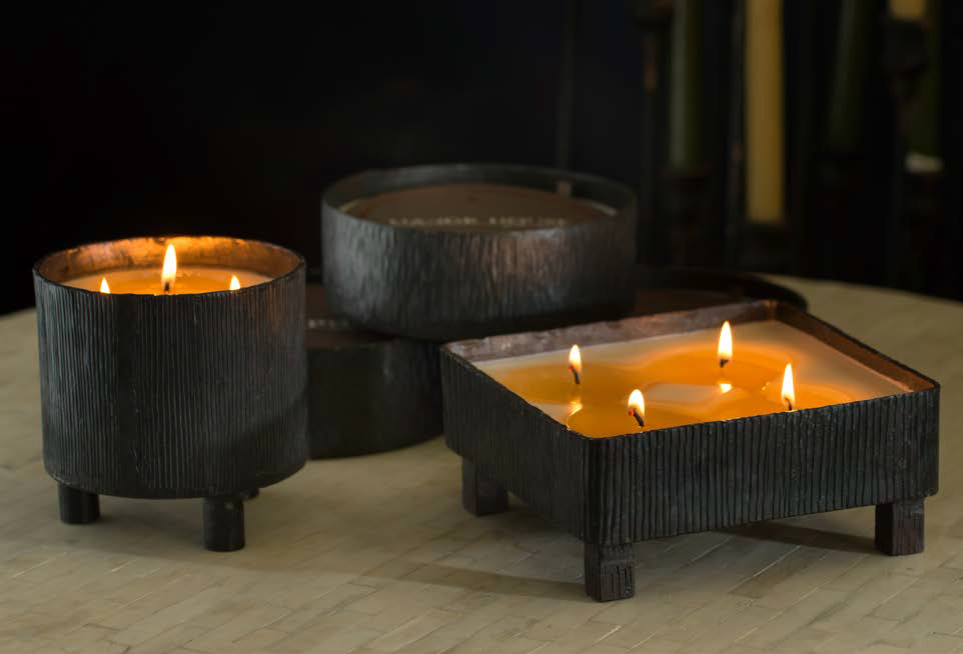 Weighty forged iron bowls with a blackened, textured finish and foiled dustcover.