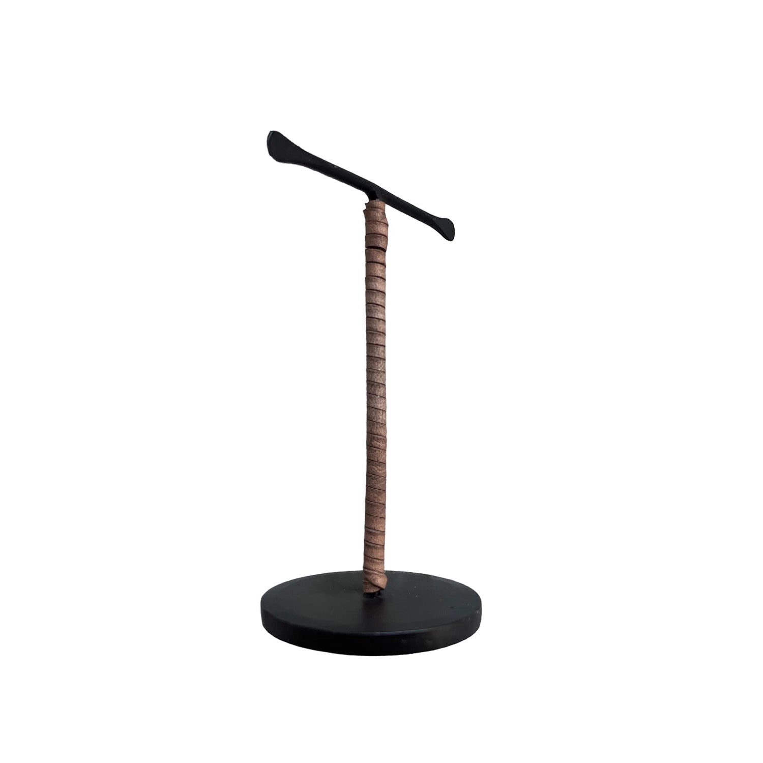 The black-finished iron Blacksmith's Jewelry Stand is deliberately simple to showcase favorite bangles and necklaces. Classically T-shaped with a sturdy base, the Blacksmith's Jewelry Stand has a hand-forged, artisan appeal. The craftsmanship is evident and is highlighted by a cream leather-wrapped post. Available in Large and Small.
