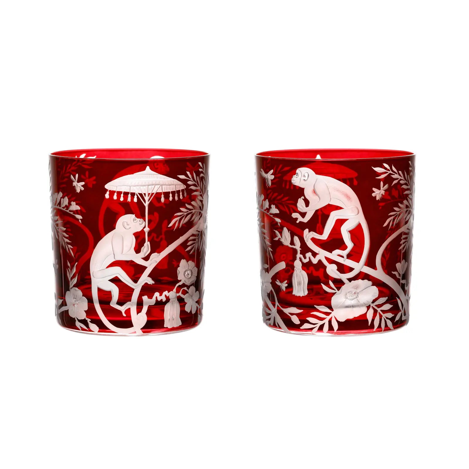 Originating in 17th-century Europe, chinoiserie is a decorative style inspired by Western conceptions of the “exotic” cultures of eastern Asia. Characterized by traditional Chinese subjects and materials, the popularity of this distinctive design approach endures to this day. Our CHINOISERIE collection includes three animal-themed motifs that are available either individually or as a set of six glasses (sets include two glasses with each design). A fourth motif, MENAGERIE, features all three creatures and is only available in large decorative shapes. Each motif in the collection features an exquisitely hand-engraved and sandblasted image of its subject surrounded by sumptuous depictions of foliage, fruits, and silk tassels. Popular colors include black, ink, and red.