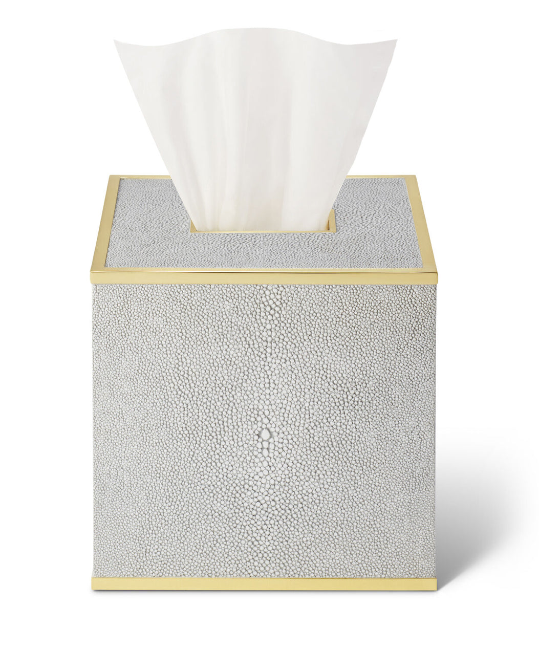 Create a clean look and organize a vanity or bathroom with this shagreen tissue box. The cover has an elegant look, edged with brass, with a suede lining.