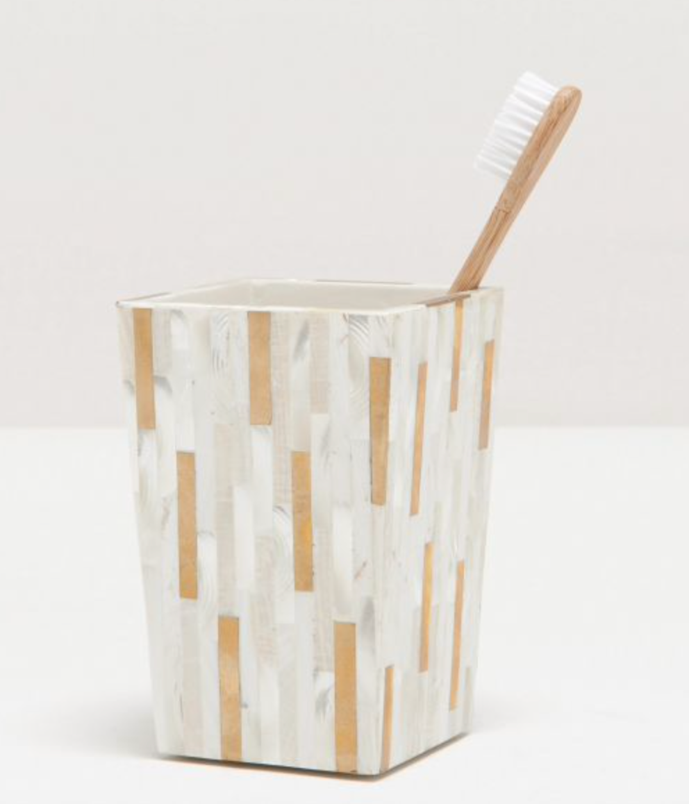 Add some understated glamour with the Cortona’s sparkle. Clamstone and troca shells show the offset pattern’s shimmer while metal rods add the shine. Go with brass to warm up a space, or cool it down with silver.