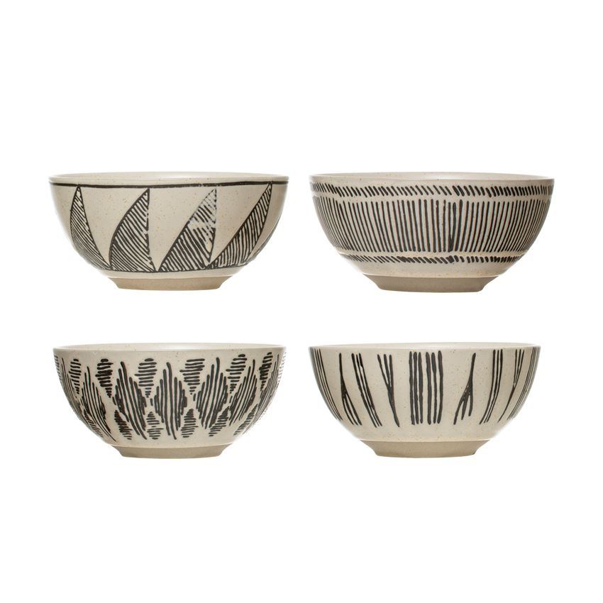 4-1/2" Round Embossed Stoneware Bowl, Black & Cream Color, 4 Styles