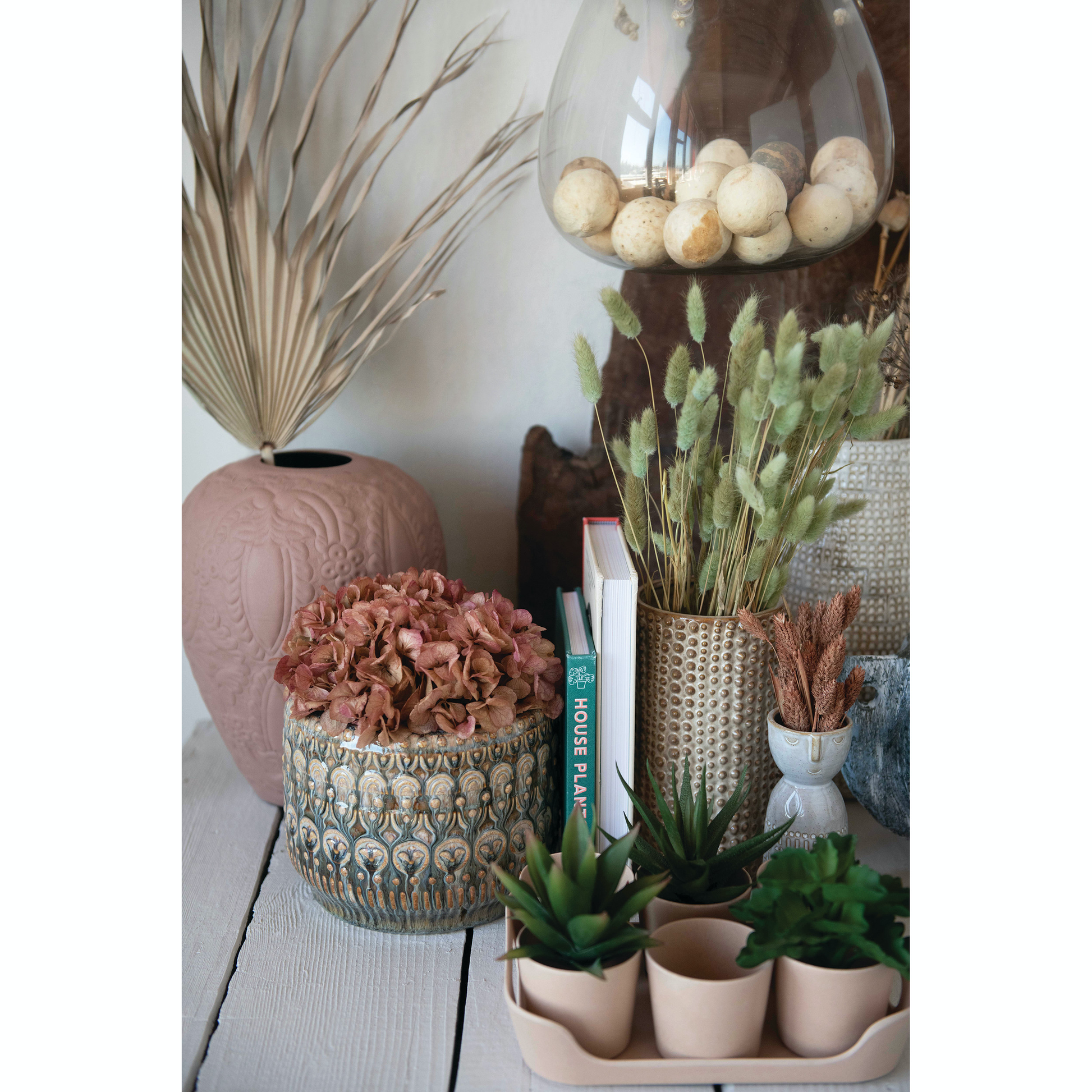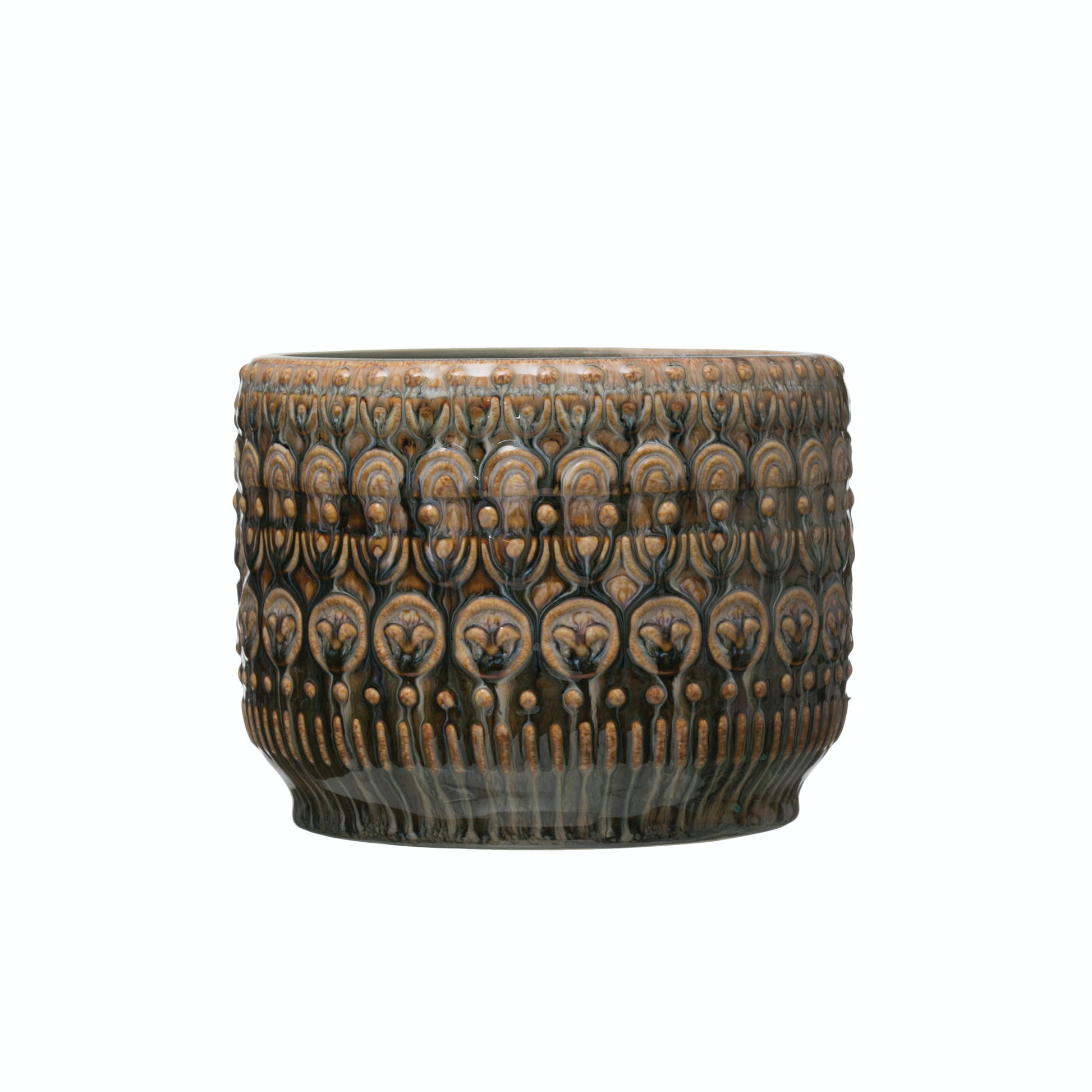 With detailed embossing and a distressed finish, this stoneware planter features a remarkable reactive glaze finish. The glazing process creates individual works of art on each distinctive piece. Fill it with a potted plant and display on a tabletop or mantel for an amazing accent to the room decor.