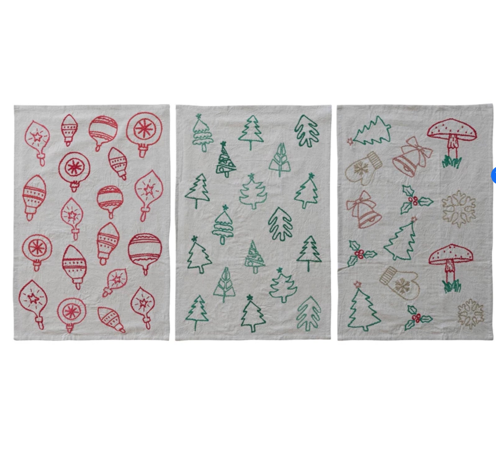 Woven Cotton & Linen Tea Towel w/ Embroidered Holiday Icons, Multi Color, 3 Styles