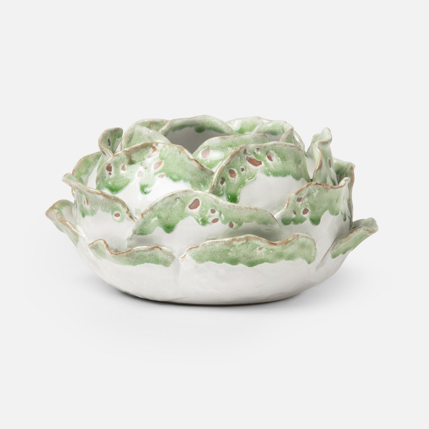 With layers of freeform hand-painted petals edged in a wash of delicate jade-green glaze, each vase evokes the lush shape of cabbage roses. Individually created, no two are alike.