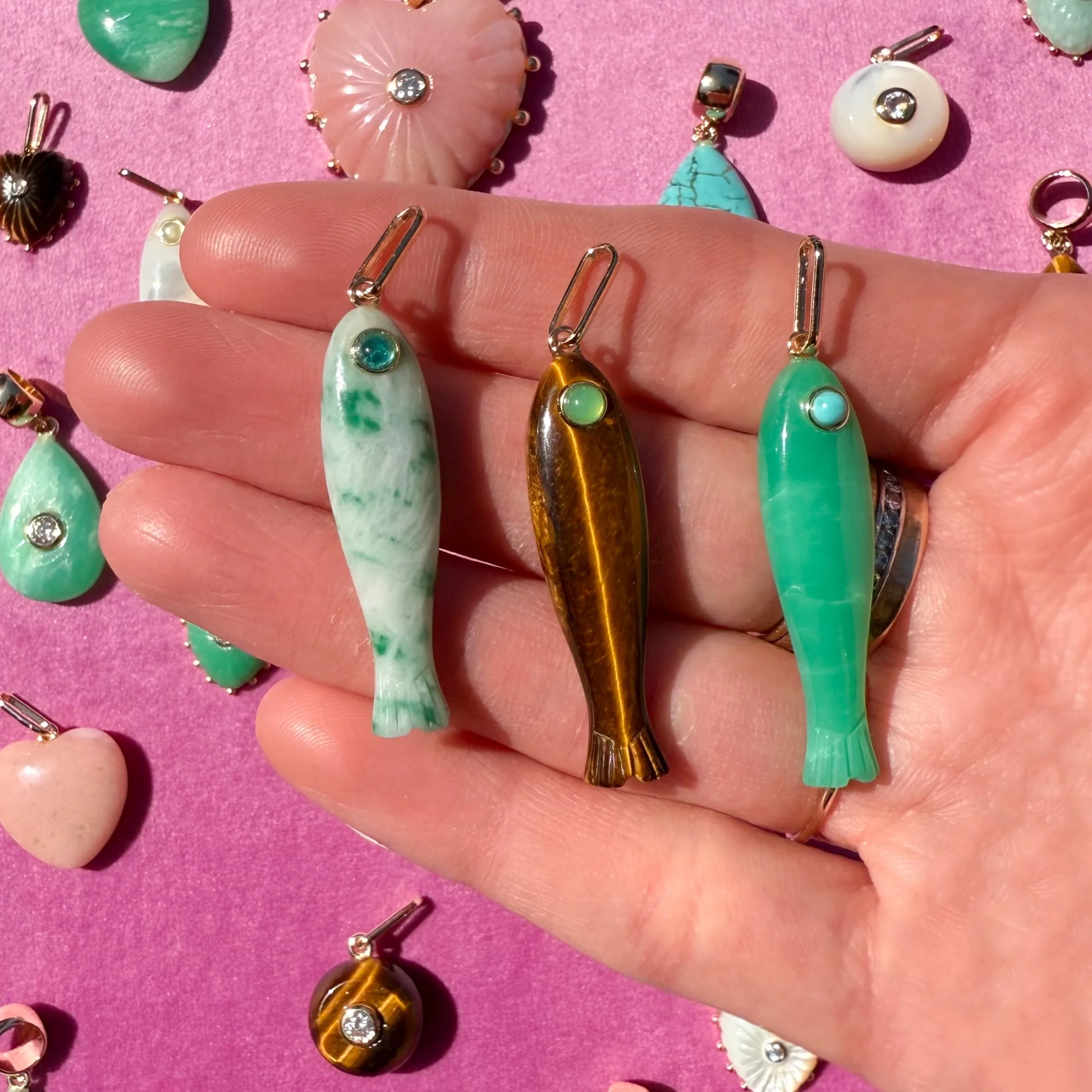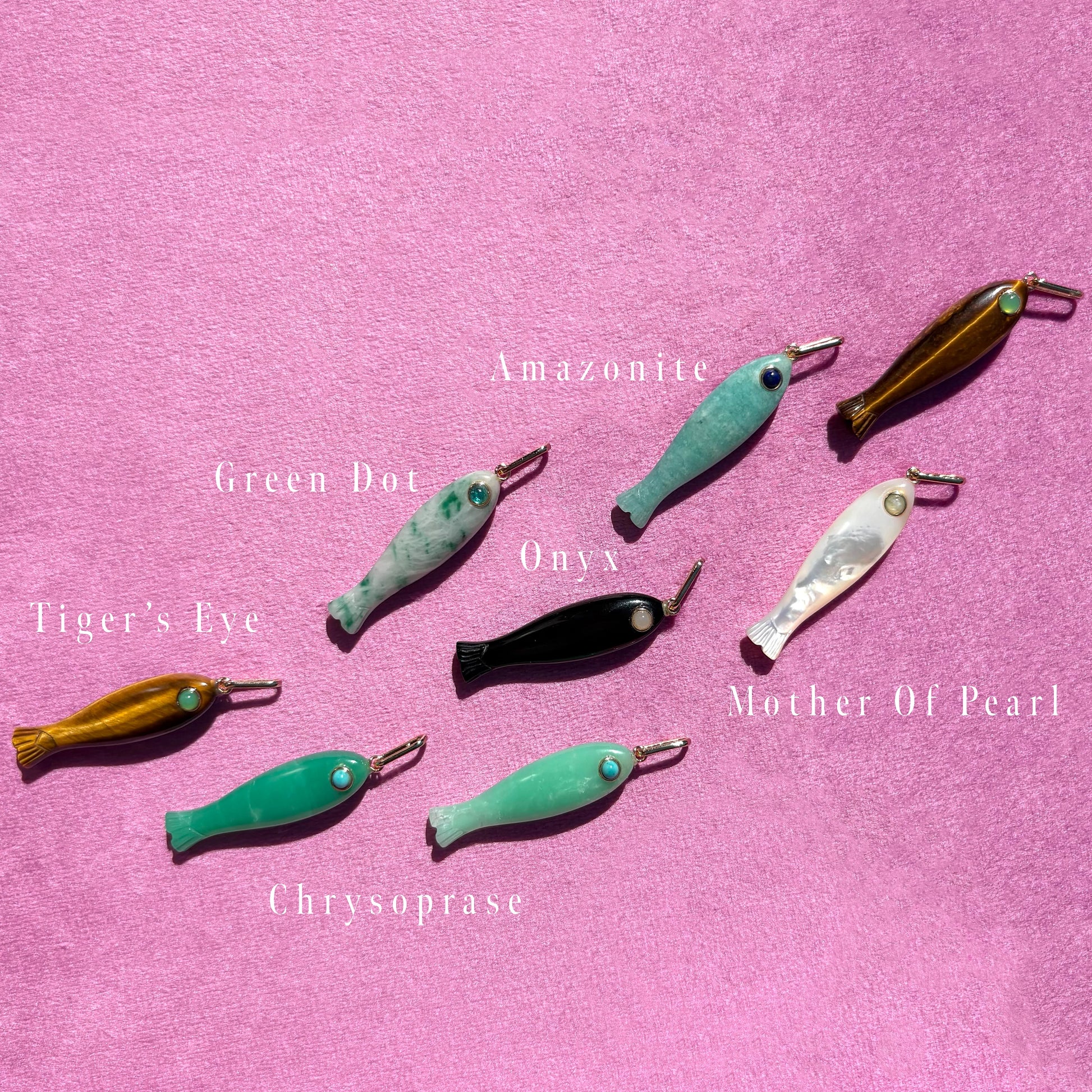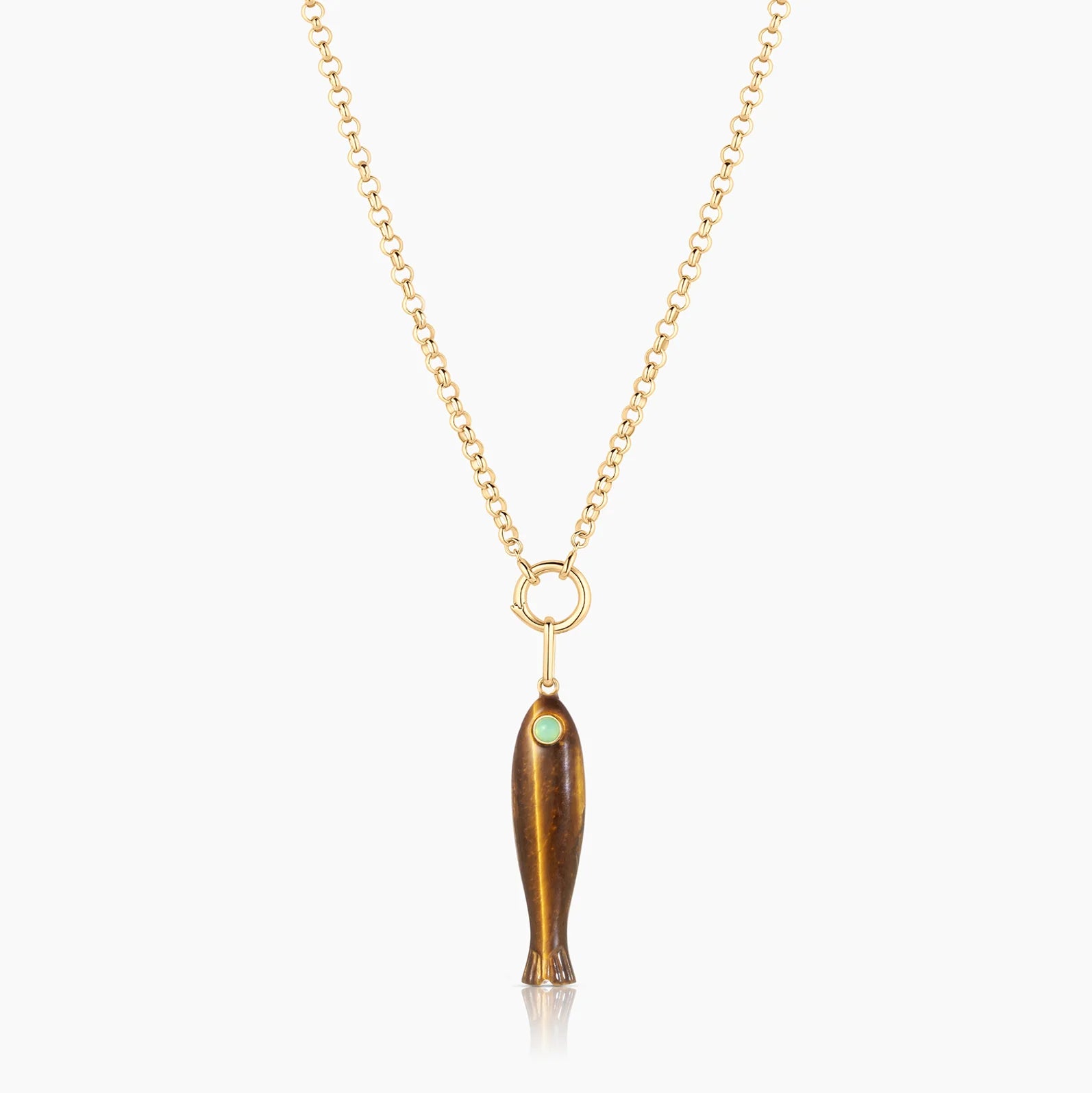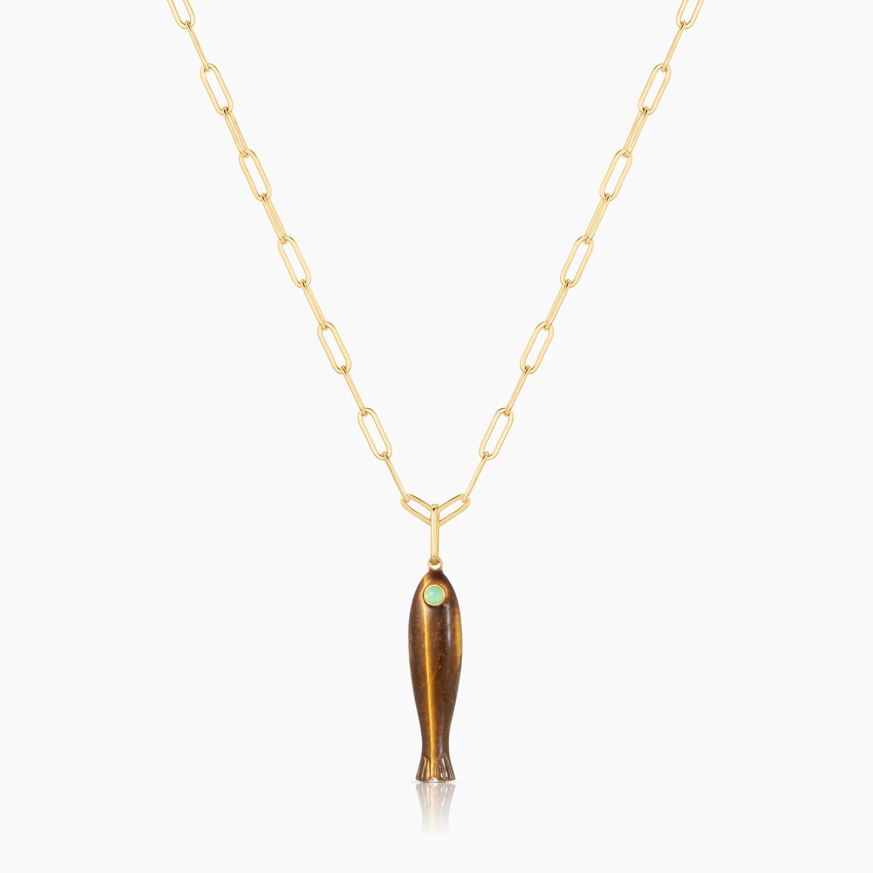 This hand-carved gemstone fish charm has quickly become the must-have charm of the season. This tigers eye (with an chrysoprase eye!) can be worn alone or layered with your other favorite charms.