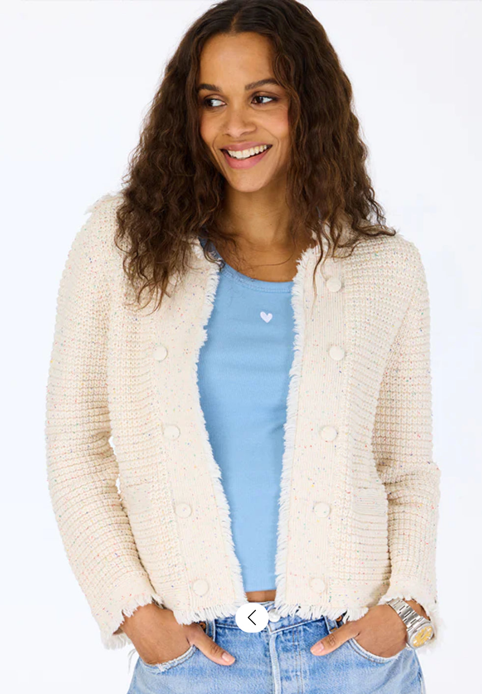 The Beaulero Fringe Cardigan is back in a soft beige with multi color specs! This 100% cotton cardigan is one of our most popular styles and a KR favorite.