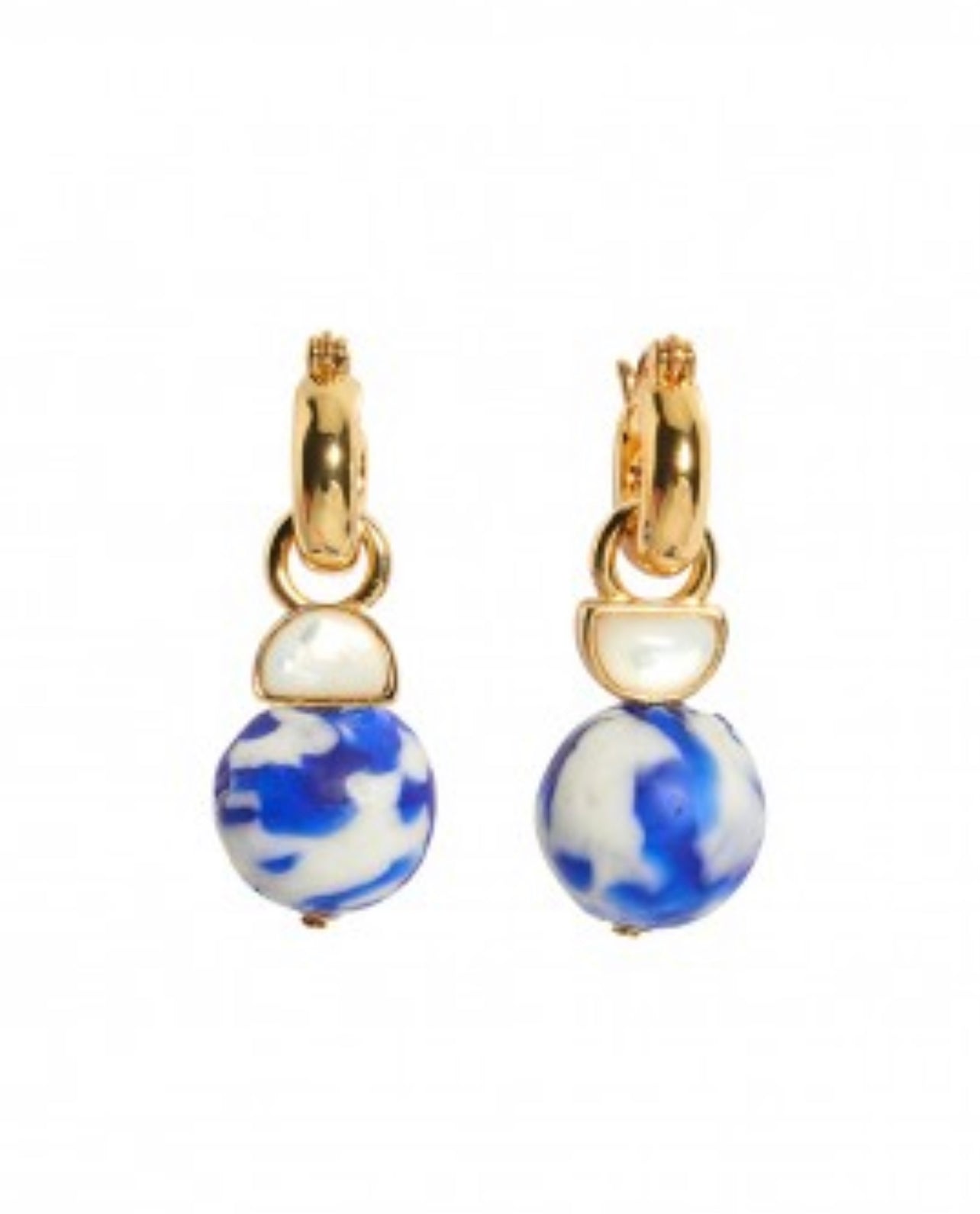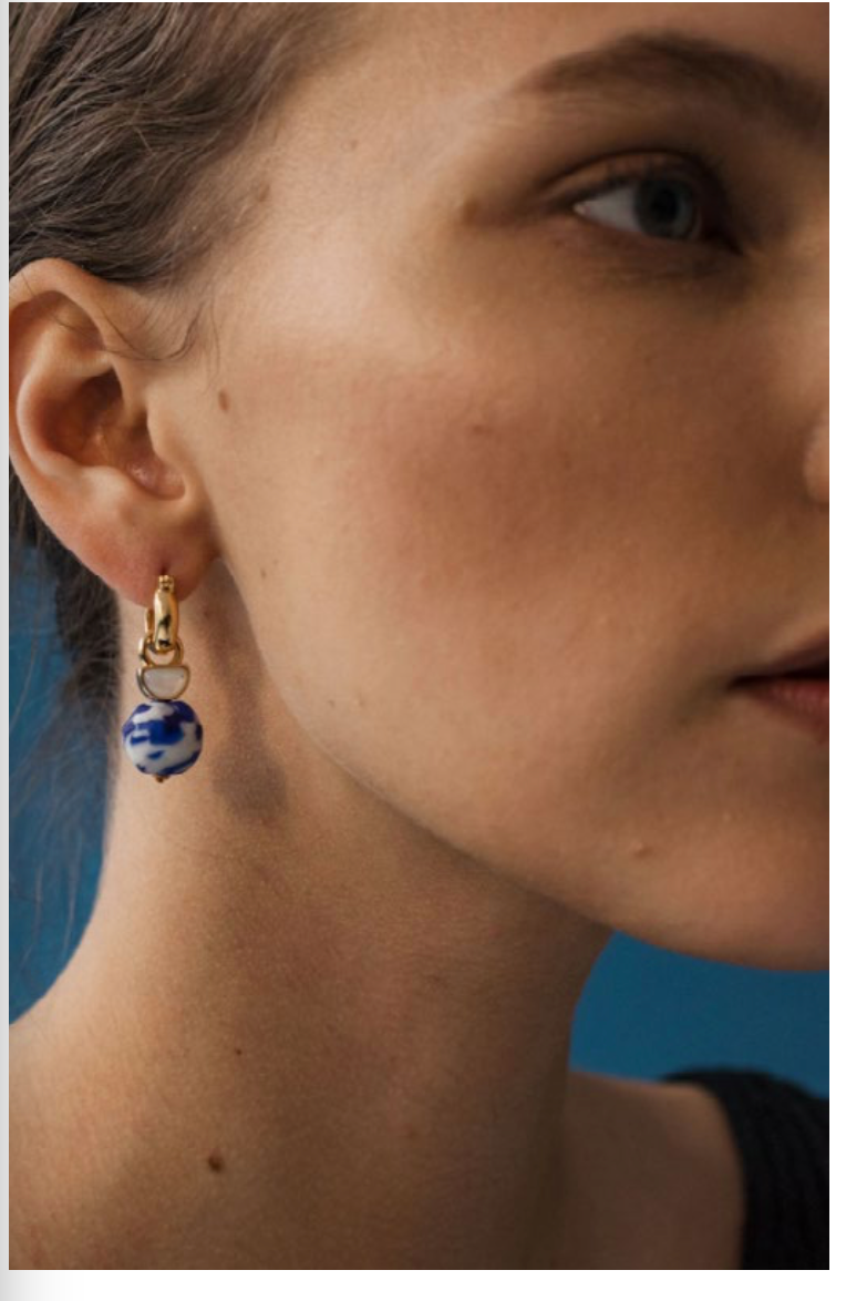 Bring a piece of paradise to your boudoir with the Cyprus Earrings, a delicate pair of gold-plated brass hoops hung with mother-of-pearl and cobalt-blue glass charms, inspired by the rich palette of the Mediterranean Sea.
