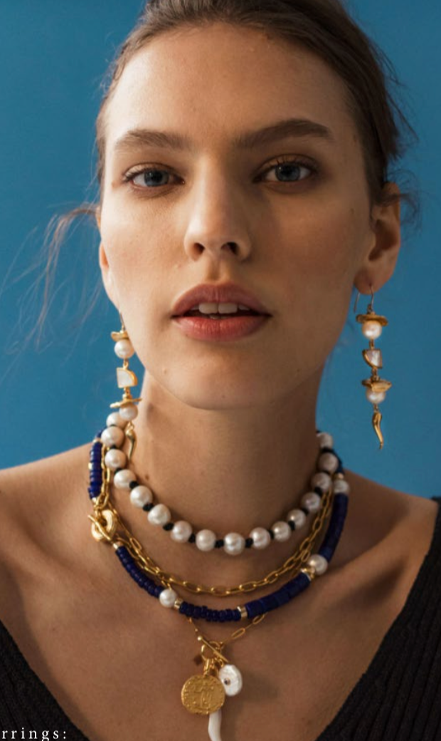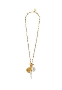 For understated style around the clock, reach for our gold vermeil chain necklace with freshwater coin pearl, gold-plated vintage coin, mother-of-pearl cornicello, and horn-shaped front toggle closure.