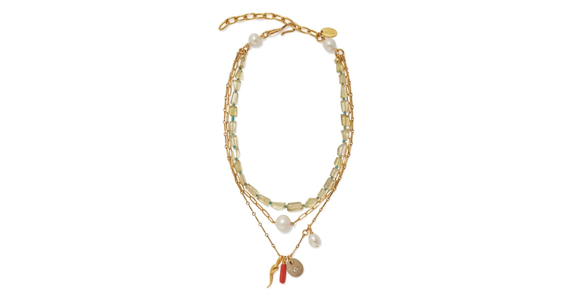 - Gold-plated brass, quartz, turquoise, freshwater pearl, topaz, coral, stone