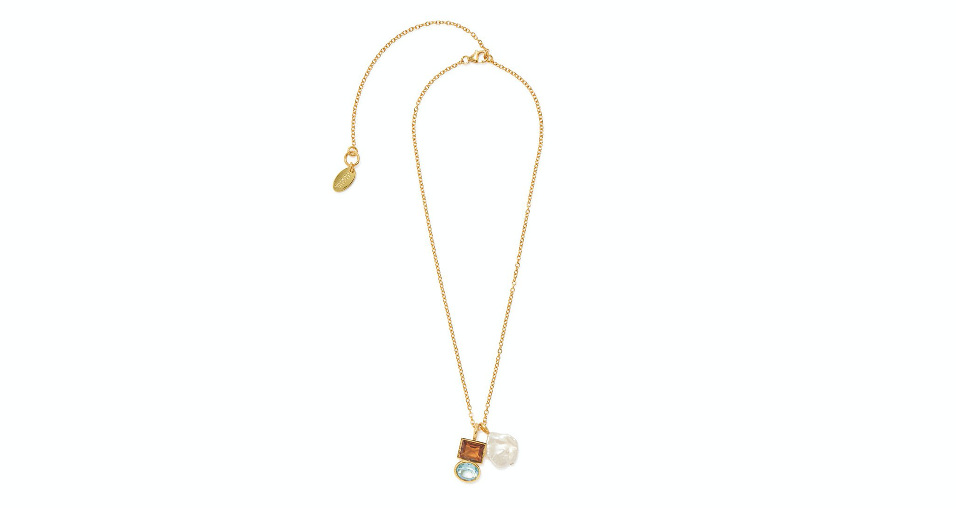 Throw it on and glow! Our newest classic gold vermeil Oasis Necklace features a freshwater pearl drop and charm in topaz and sky blue Swarovski crystal.