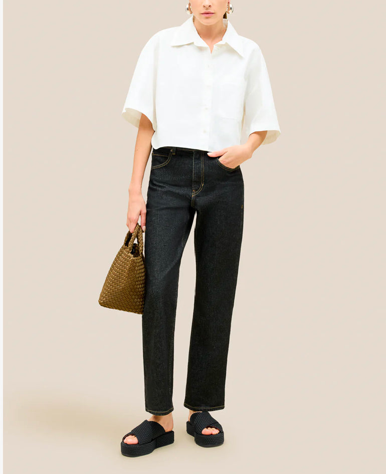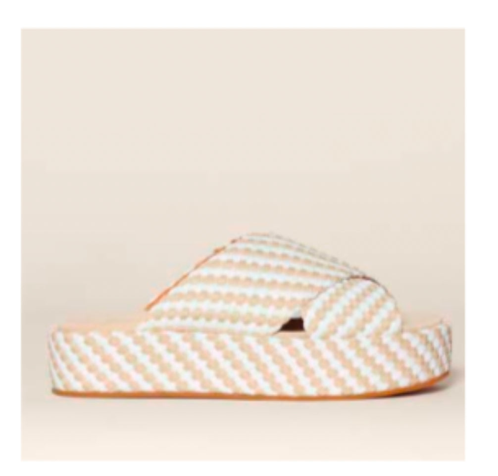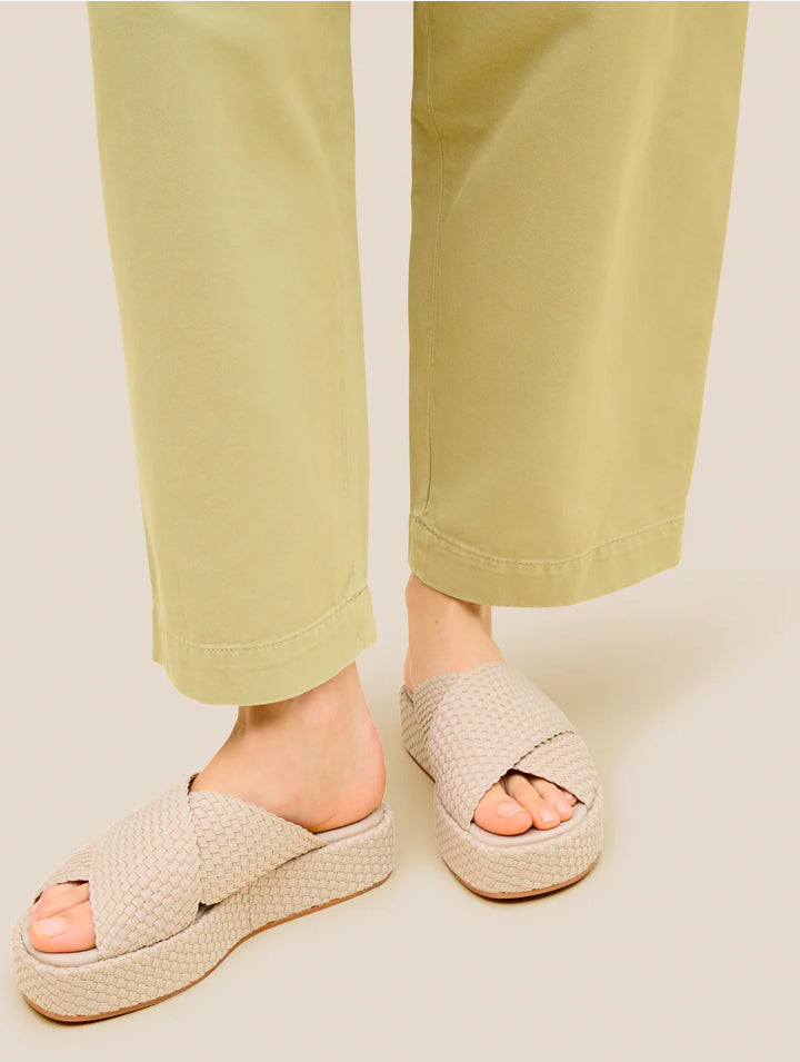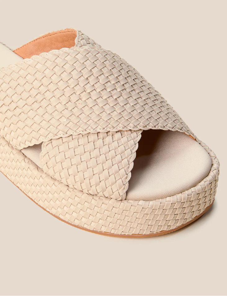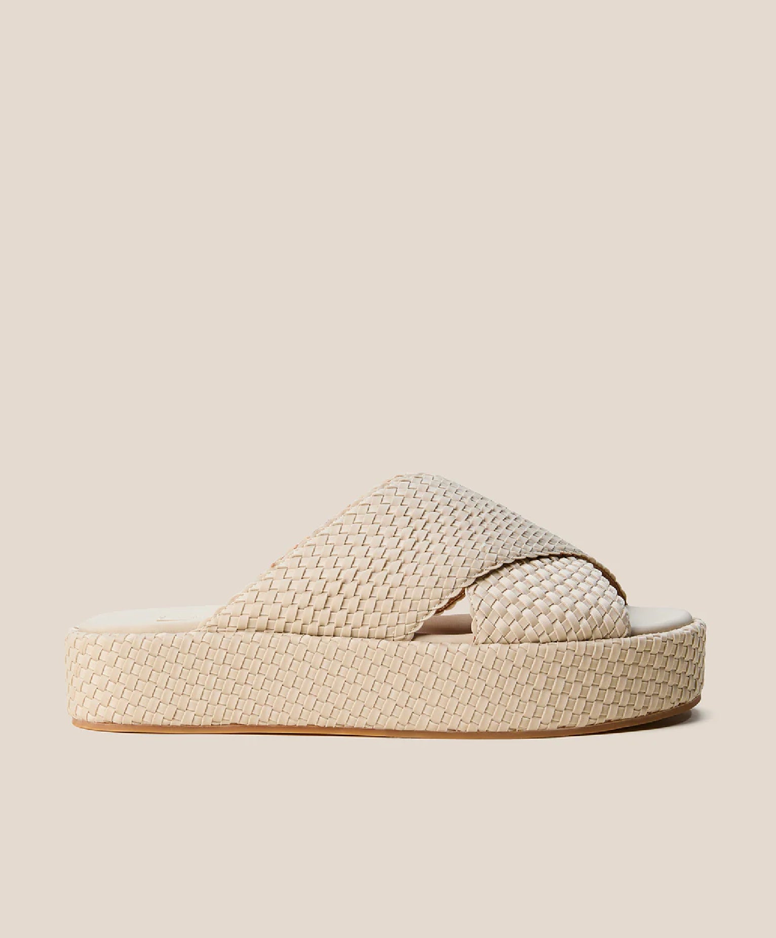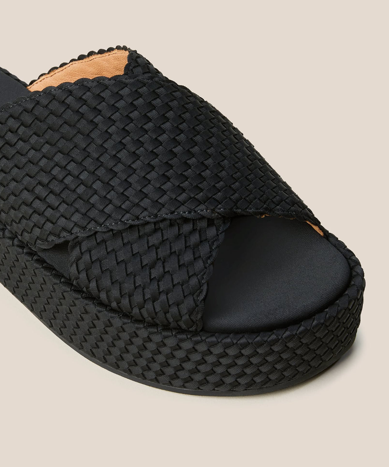 A laidback yet elegant platform sandal in black handwoven neoprene.