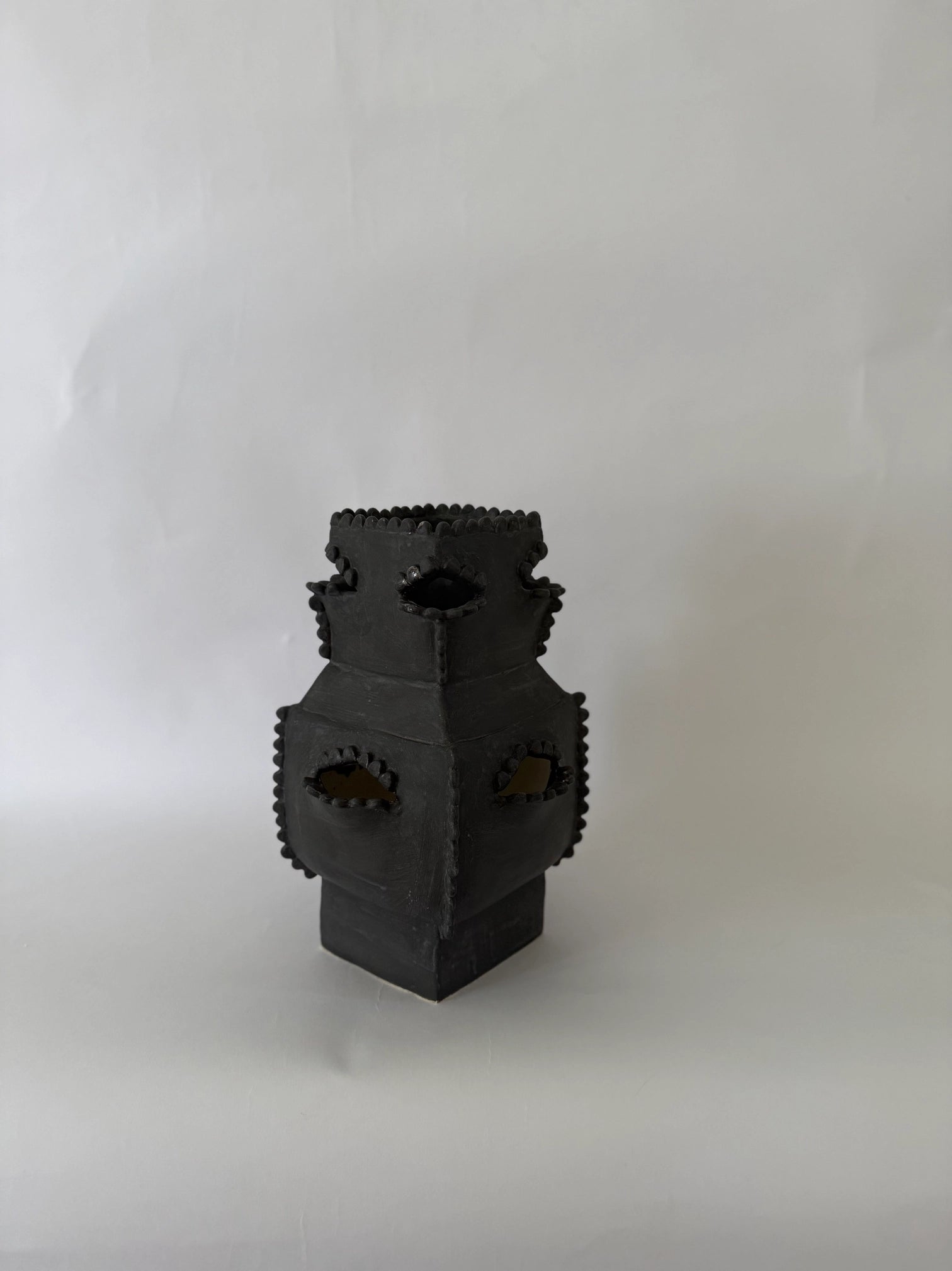 Handbuilt ceramic tulipiere with scalloped detailing and a charcoal glaze. The interior is glazed and watertight. There are eight openings around the sides of the vase for arranging tulips as well as a large opening at the top.