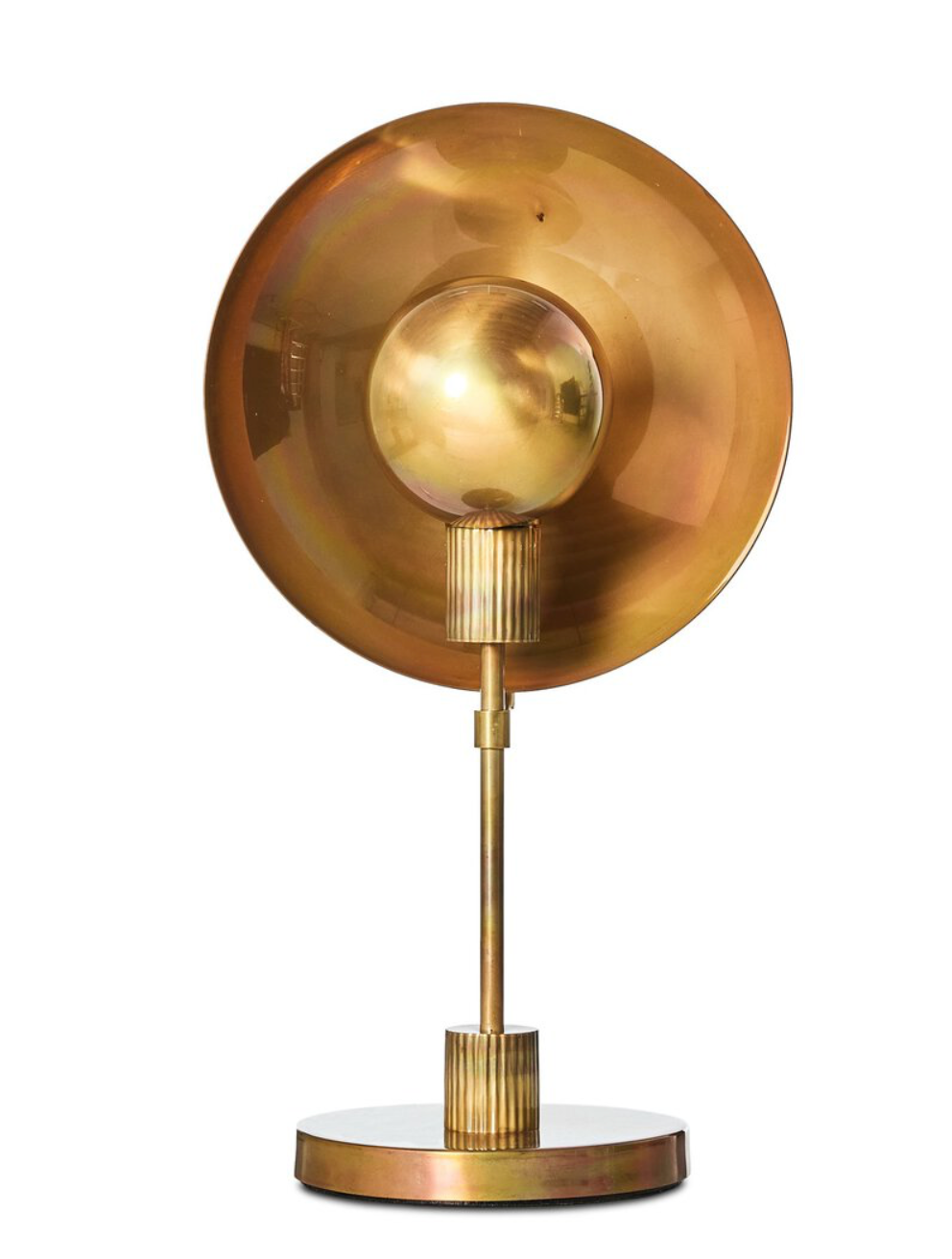 Diffused lighting inspired by 1920s design. A glowing disc nestles within a curved brass reflector, creating a warm, expansive ambiance. Textured socket and stem with a hand-burnt brass finish that ensures each piece ages uniquely.