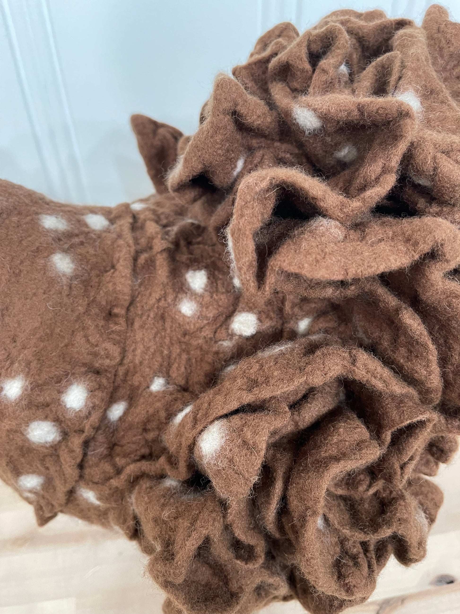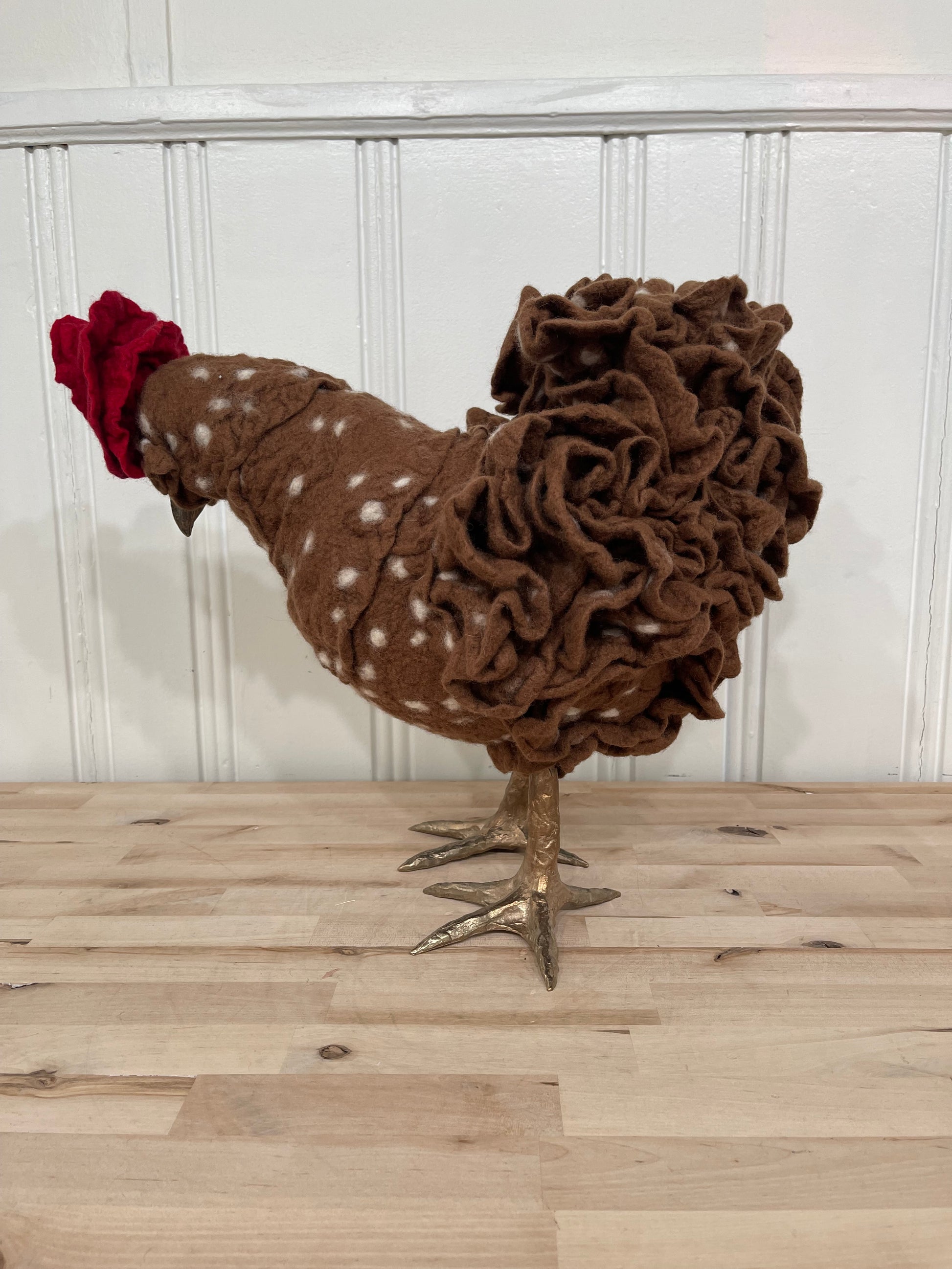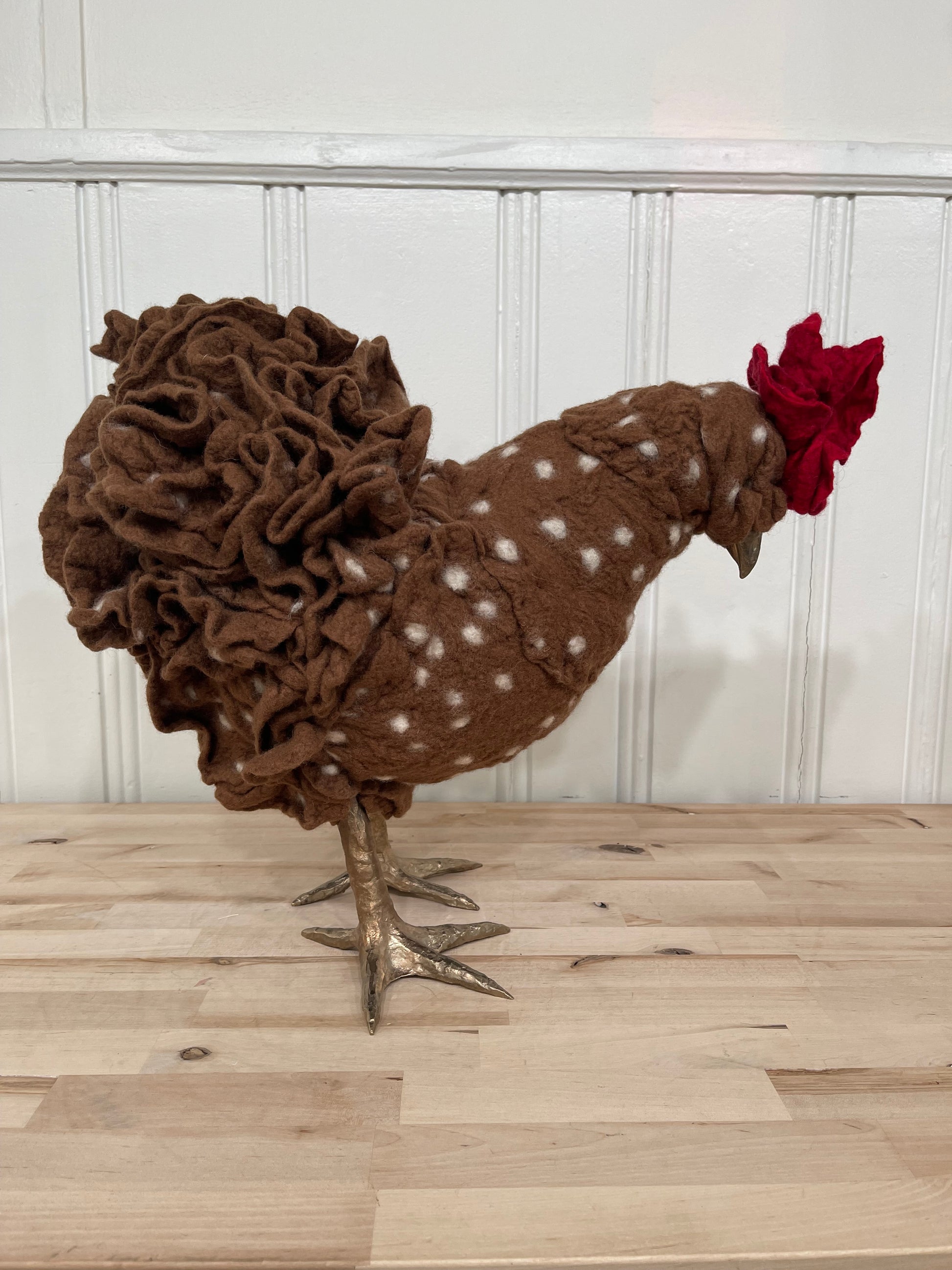 The chickens are sculpted with care and delight, upholstered to function as footstools. Each is one-of-a-kind, unique in posture and personality. A turned wood egg-shaped core stands on bronze feet and is connected to a bronze beak. Feathers are fashioned with traditional fiber art techniques- dyeing, felting, spinning, knitting- and are stitched by hand. And a surprise? Their heads bob