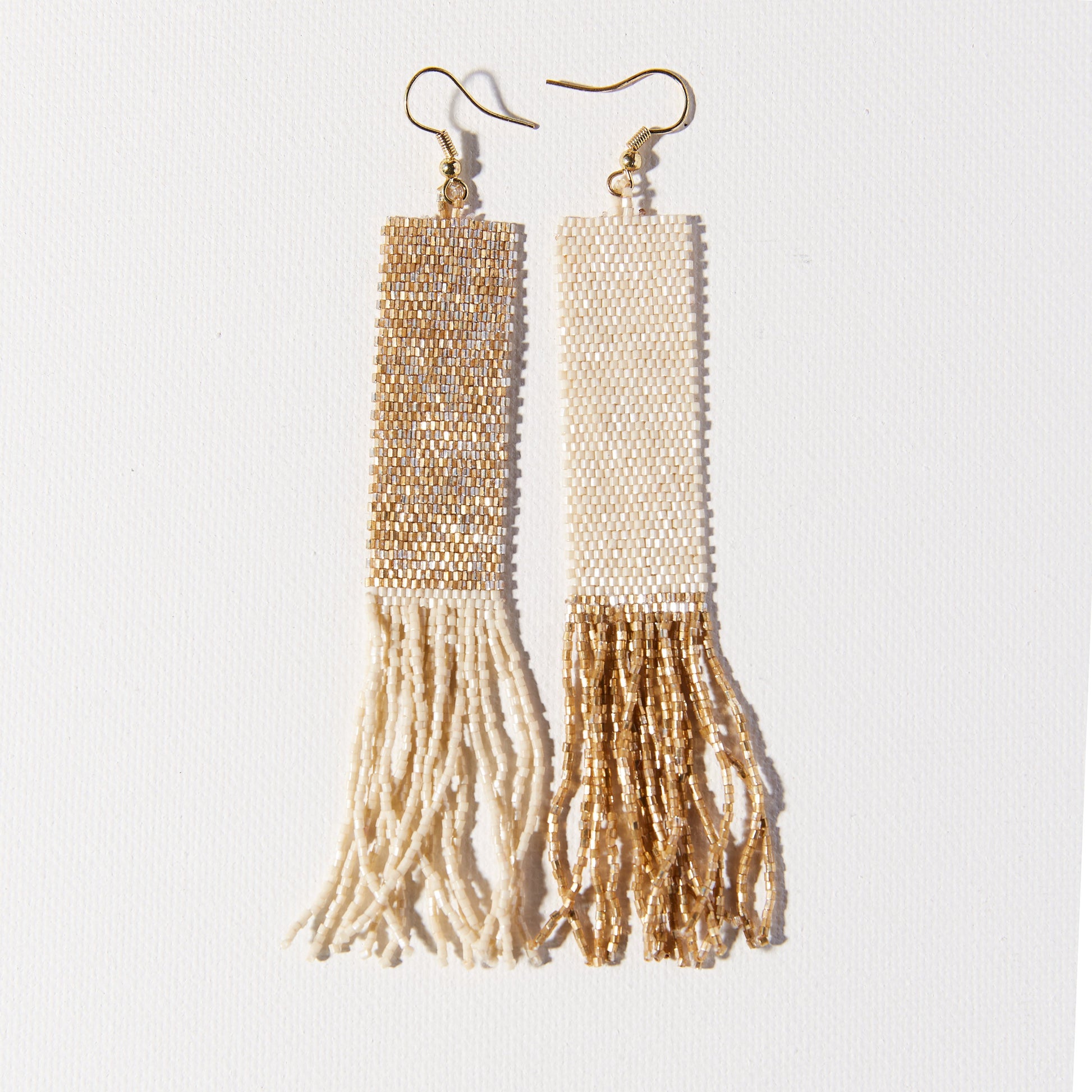 Part of our signature seed bead collection, these amazing fringe earrings offer a unique look as they hang from a brass triangle at the top. They are handcrafted by artisans in India and are sure to add an effortlessly cool edge to any modern boho look.