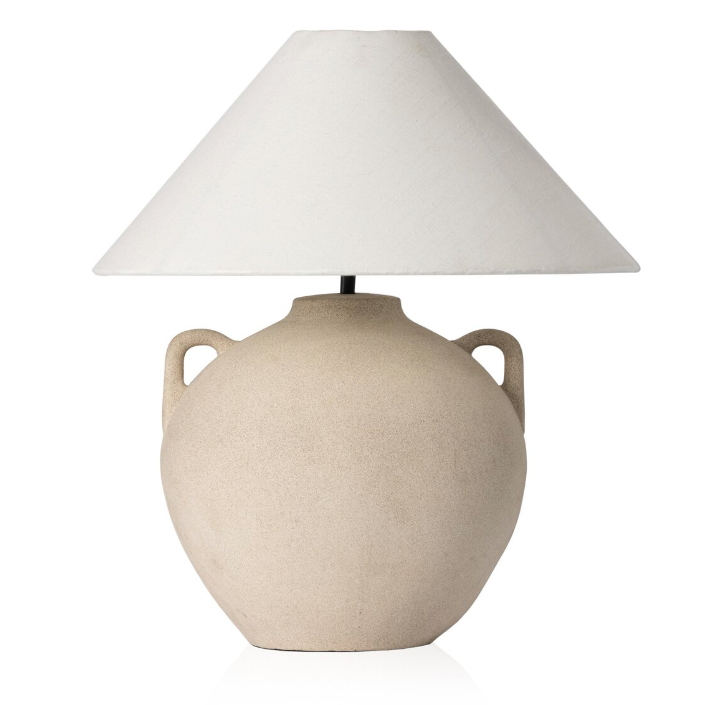 Inspired by vintage clay jars, a light sand-colored talavera style lamp with handle-like detailing pairs with a tapered linen shade in a versatile ivory.