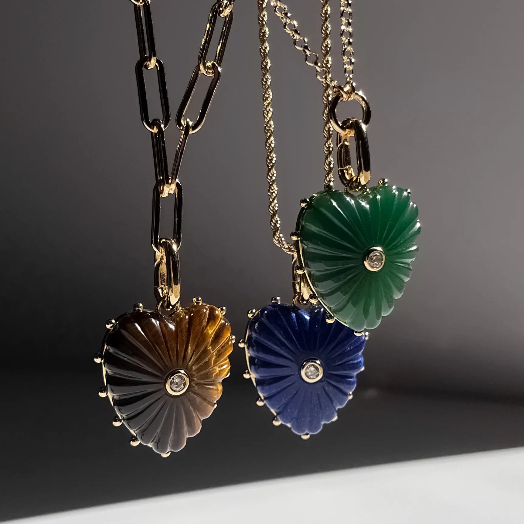 14k gold plated carved jade with cubic zirconia heart pendant on hinge clip.