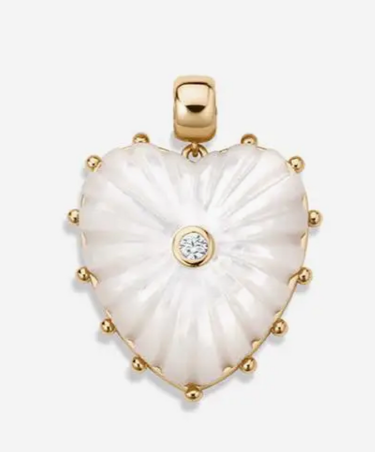 This heart charm in luminous mother of pearl carved stone, cubic zirconia, and high-shine gold is everything you want and need to make a statement.