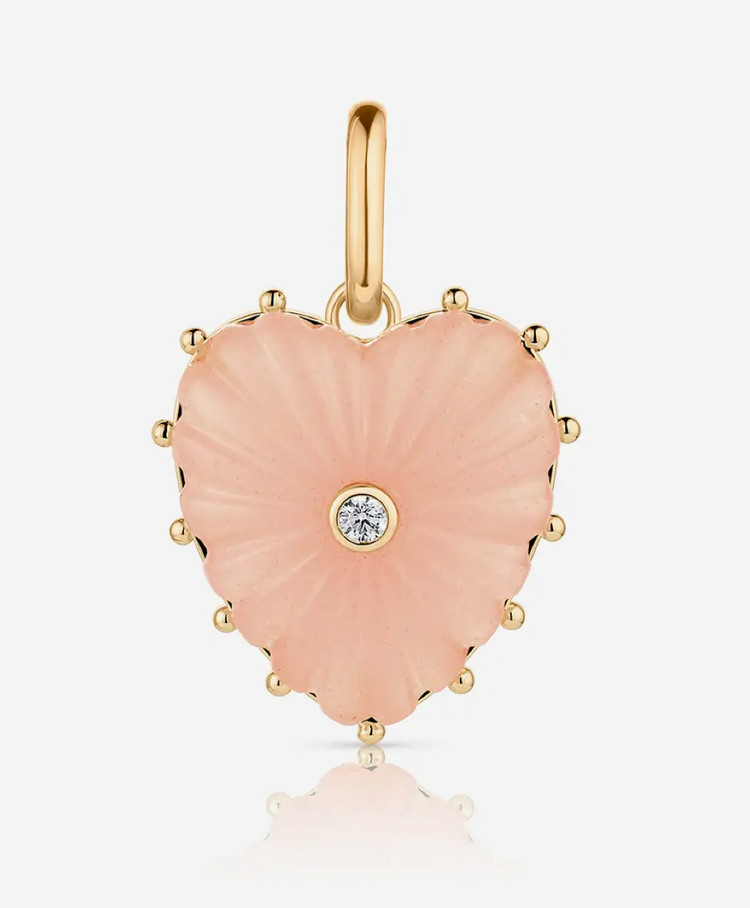 14k gold plated hand-carved pink jade with cubic zirconia heart pendant on hinge clip.