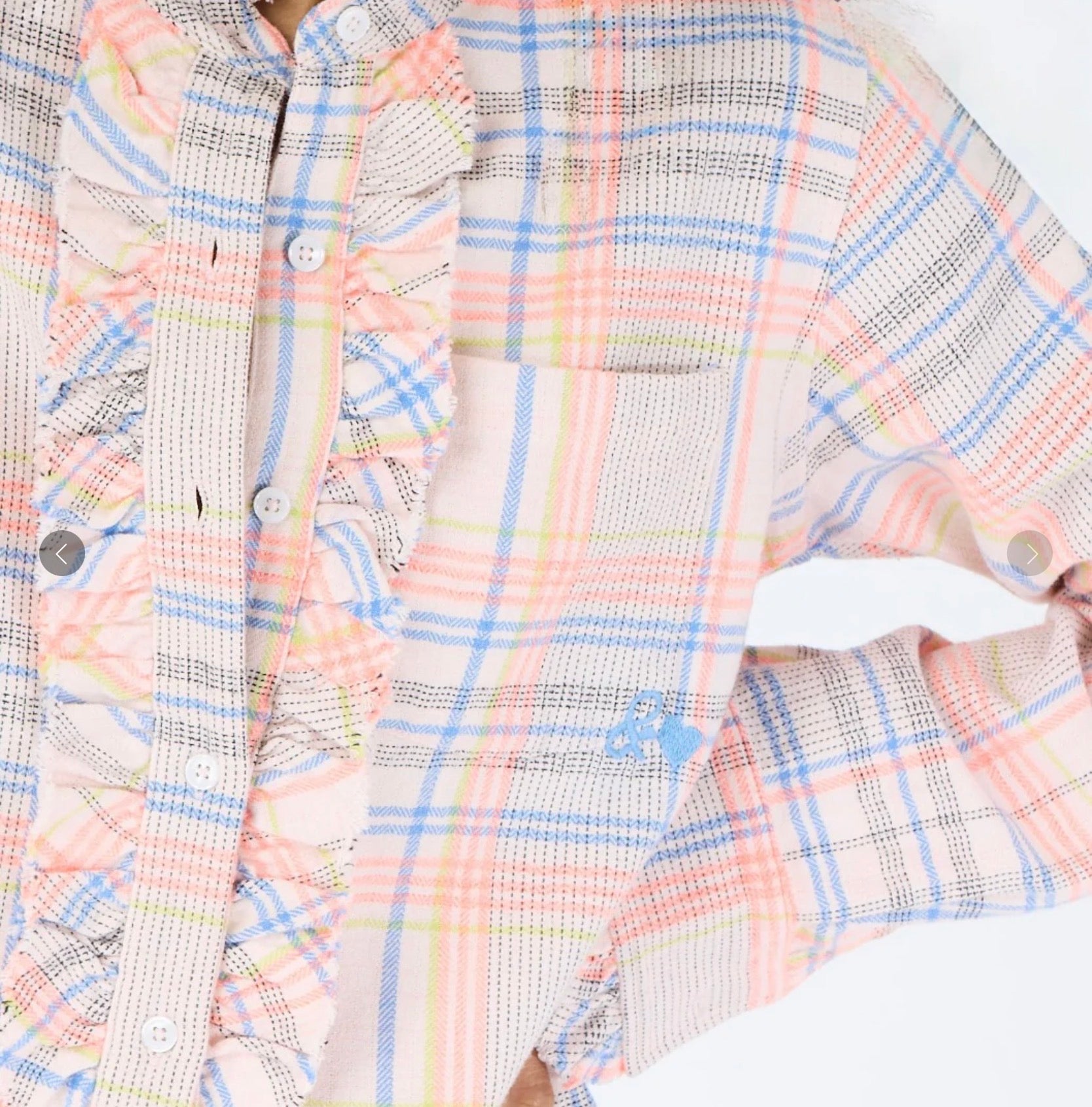 The Molly Plaid Shirt is made from the softest plaid cotton-flannel. The flannel is super fine to create drapes for a more feminine look with a ruffle front, collar & sleeve.