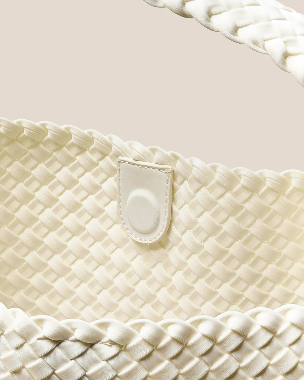 Handwoven neoprene in Jasmine. The Nomad Medium Hobo is spacious and comfortable for all-day wear, with a wide strap that sits flat on the shoulder.