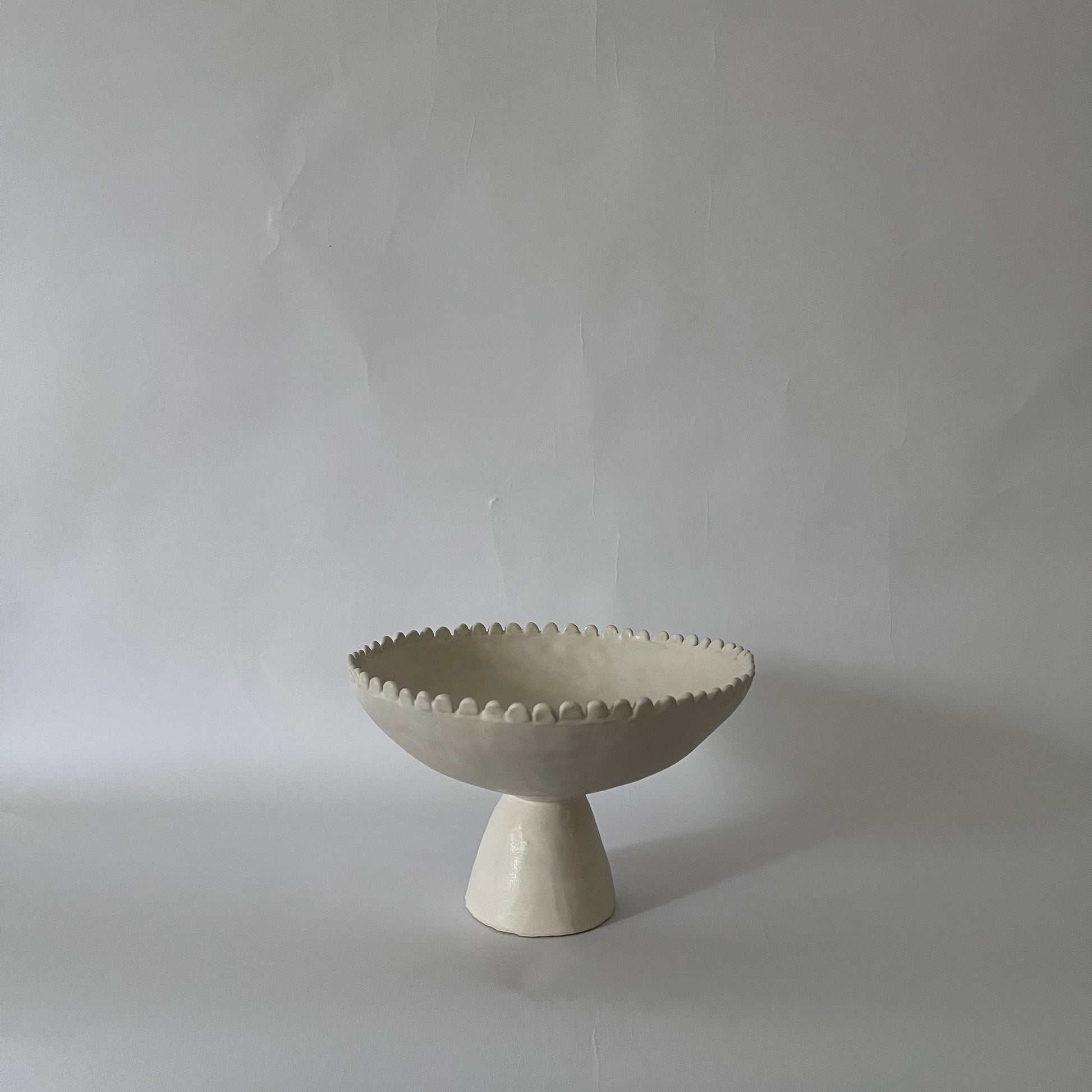 hand built scalloped ceramic pedestal fruit bowl with soft white glaze. glaze is food safe approximately 5.75"H, 9"W"