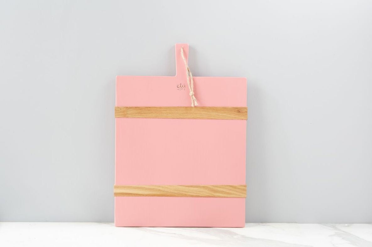 These reclaimed wood boards are distinguished by two strips of contrasting timber. For a modern spin, the serving board boasts a pink 100% plant-based, food-safe wax finish and the slats have maintained their exquisite organic beauty. Ideal for use as a charcuterie plate, showcasing bread, cheese or fruit, the wood bread board can also be used as a decorative kitchen accent.