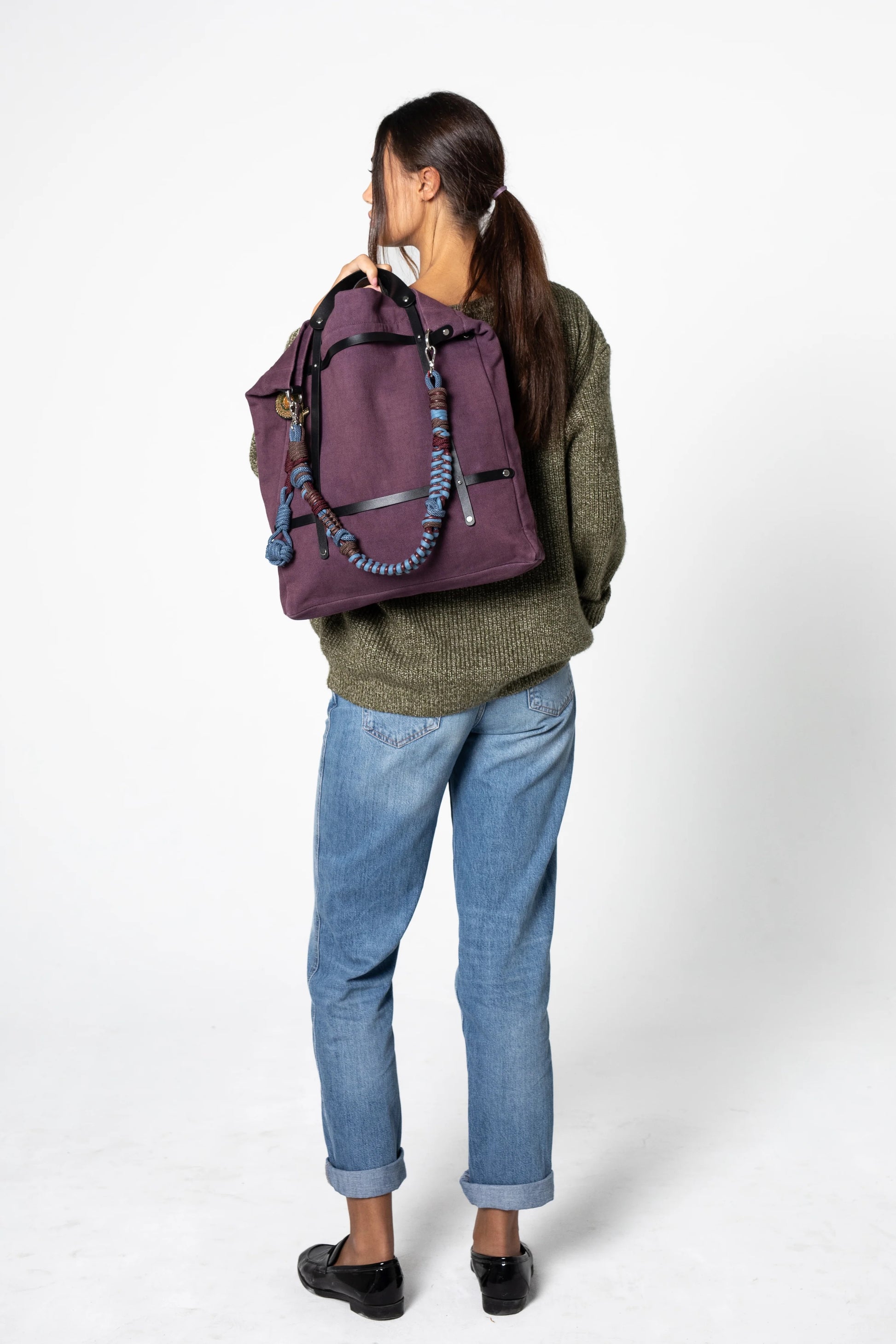 An expressive macramé creation that plays with textures and contrasts. The mix of deep purples and sky blues brings a bold, joyful twist to your everyday accessories. Add it to your bag and turn a simple outing into something special.