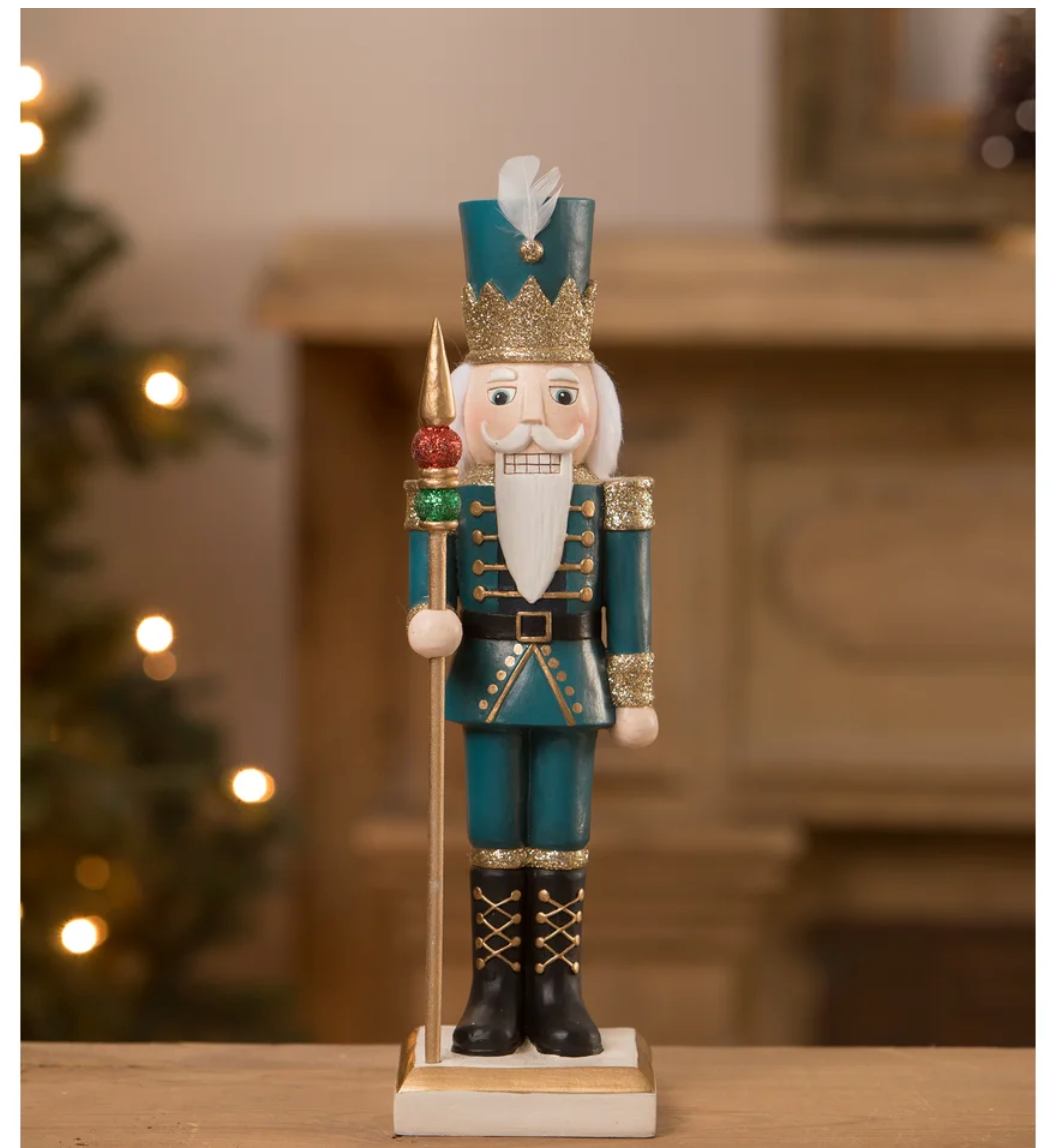 This sapphire blue nutcracker, with metallic gold and glitter accents, stands tall holding a metallic gold staff with red and green glitter details.