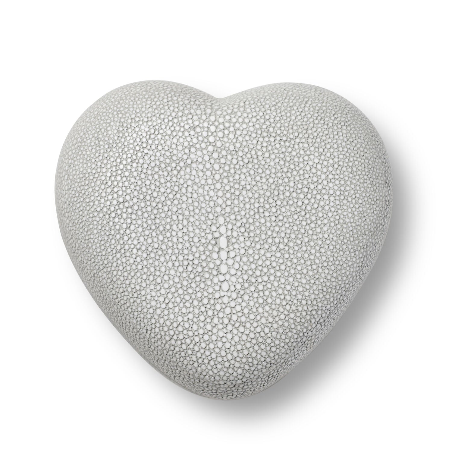 Pretty box in cream is made of delicately embossed shagreen. The heart shape is just the right size for essentials, from keys to jewelry, and adds a sweet touch of whimsy to any vanity or table.