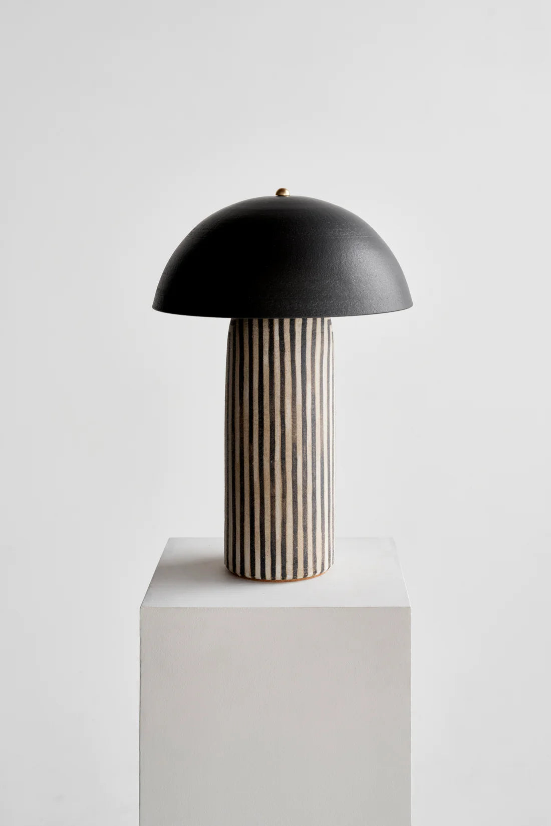 The Tera Lamp is signature table lamp, known for its classic silhouette, thoughtful proportions and earthy finishes. The Stripe finish features black and white stripes that are hand painted in a matte underglaze, allowing the texture of the stoneware to come through. + black shade.