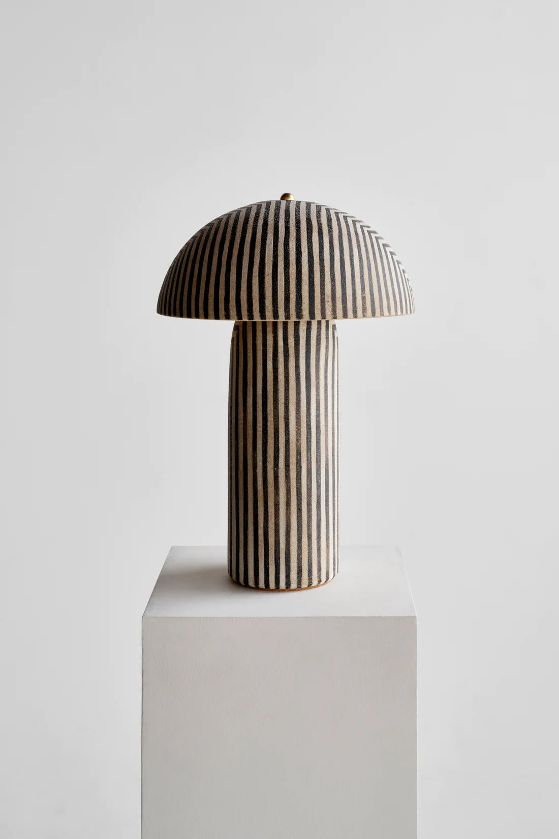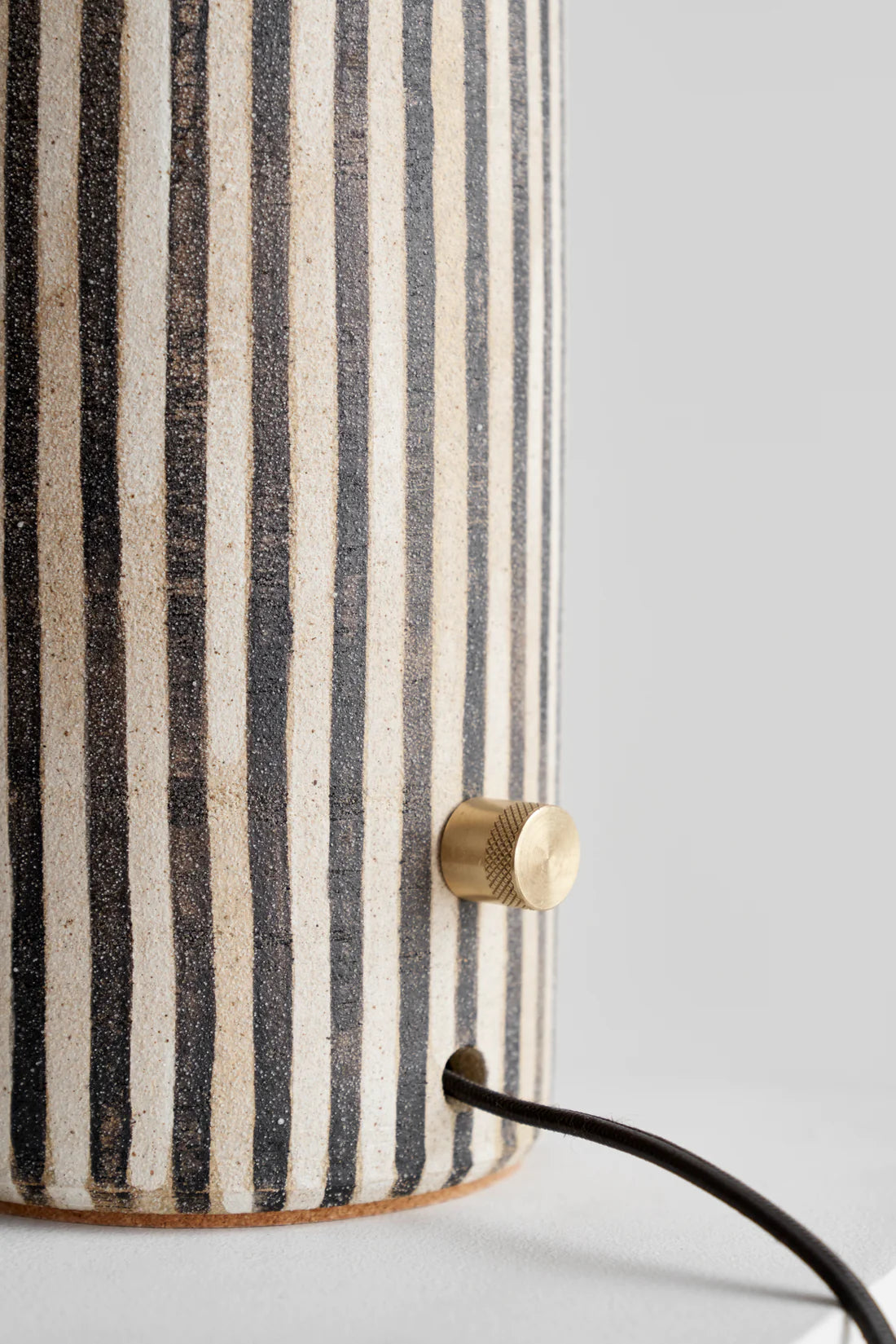 The Tera Lamp is a signature table lamp, known for its classic silhouette, thoughtful proportions and earthy finishes. The Stripe finish features black and white stripes that are hand painted in a matte underglaze, allowing the texture of the stoneware to come through. Stripe shade!