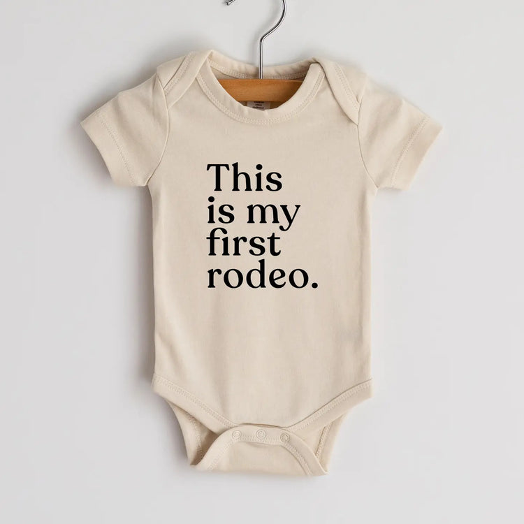 This Is My First Rodeo" • For the newest little ones! This super-soft, 100% organic cotton outfit features modern typography in crisp black ink on a luxe cream colored bodysuit - designed with love and screen printed in-house. The perfect humorous outfit for a new babe! Features: • 100% Organic Cotton • Water-based dyes • Environmentally-friendly and naturally hypoallergenic • Sustainably sourced and ethically produced • Printed by Hand in Ohio • USA Made
