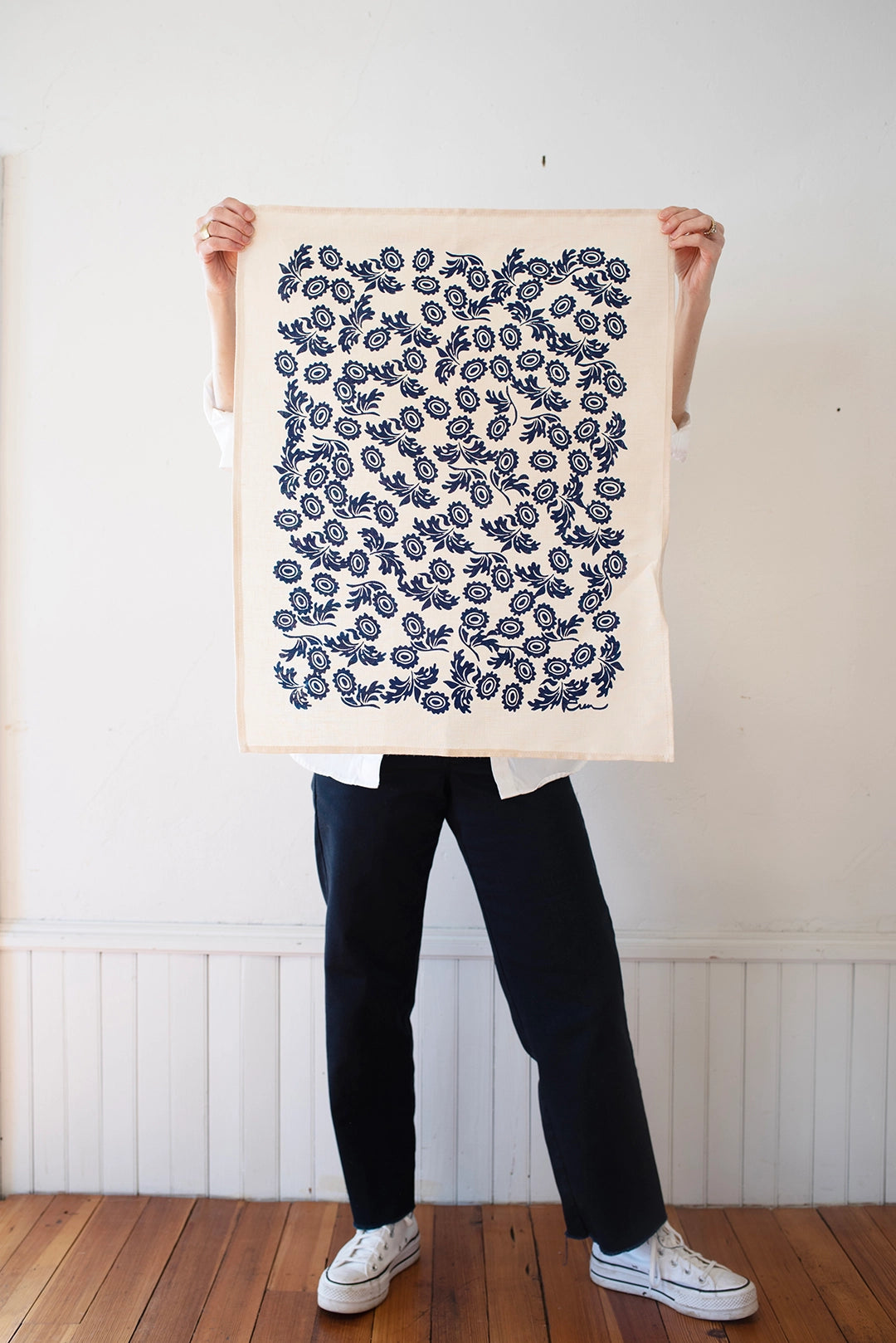 Hand drawn pattern and silk screen printed with water-based solvent-free inks with hem finish. Perfect for adding a pop of color to your kitchen! Dimensions: Approximately 20" x 26" Care: Wash cold with mild detergent. Lay flat to dry. Iron as needed.