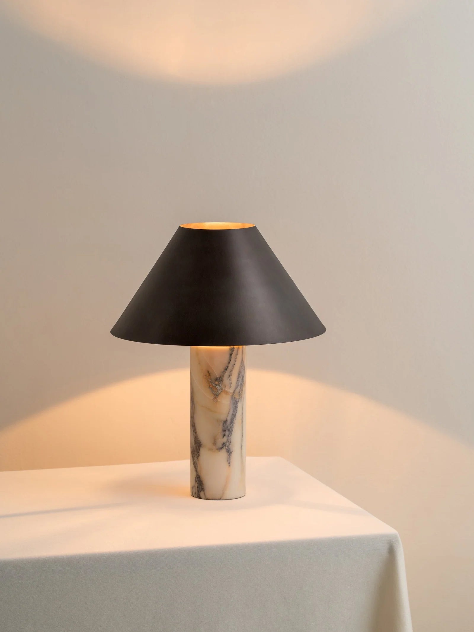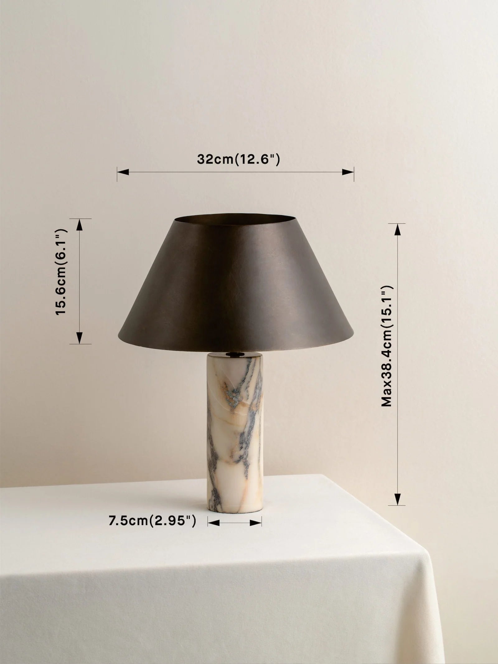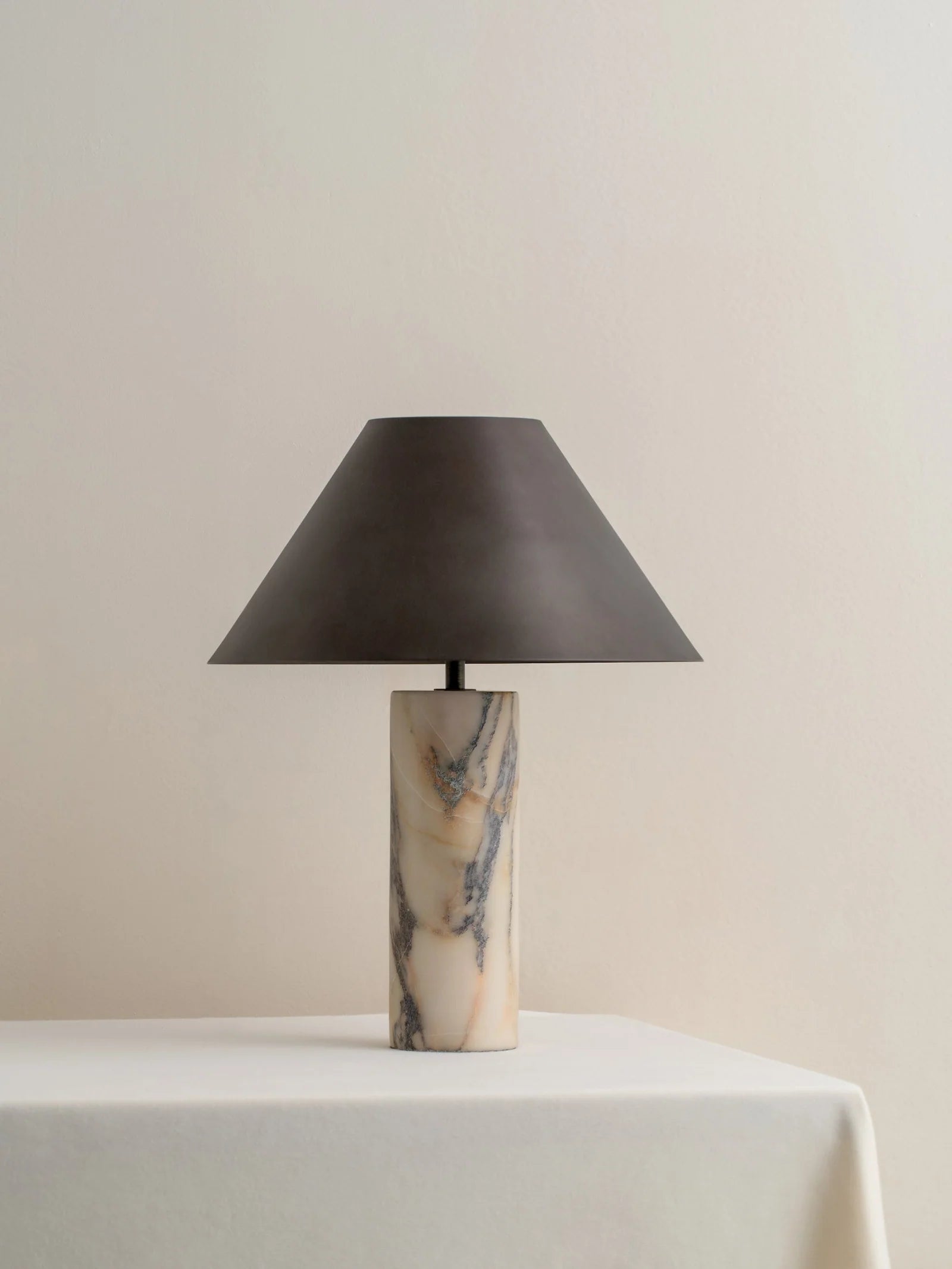 Sophisticated and refined. This table lamp combines a unique white marble base with a rich tapered bronze shade. The intricate veining and natural colour variations of the lamp serve as a statement focal point, showcasing the lamp’s exceptional design and craftsmanship.
