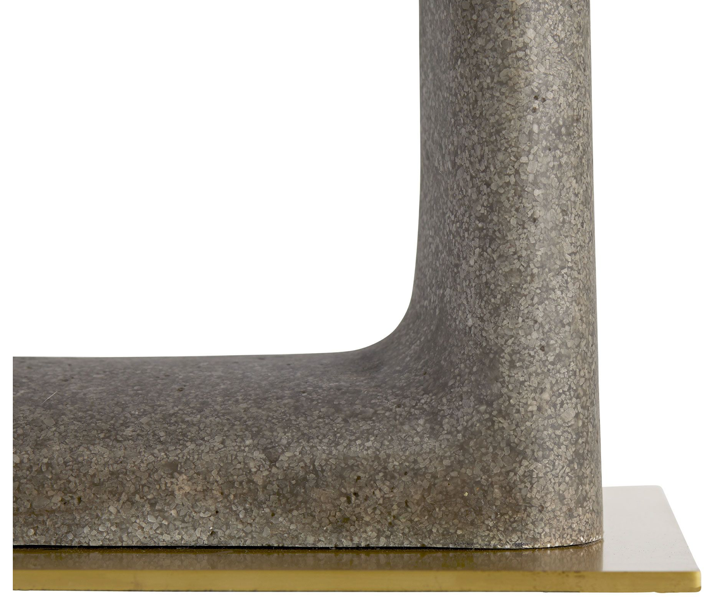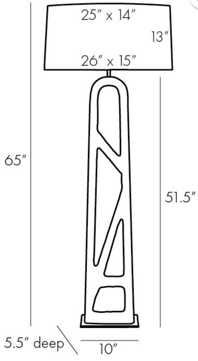 The unique form of this floor lamp creates interest and intrigue. The sculptural graphite ricestone base has been shaped into an arched, open design that brings forth a dimensional quality to the space it occupies. The entire structure is fashioned to a rectangular antique brass base for additional geometric appeal. Its narrow silhouette makes it a great living room luminary. Topped with a white linen drum shade with white cotton lining and an antique brass sphere finial.