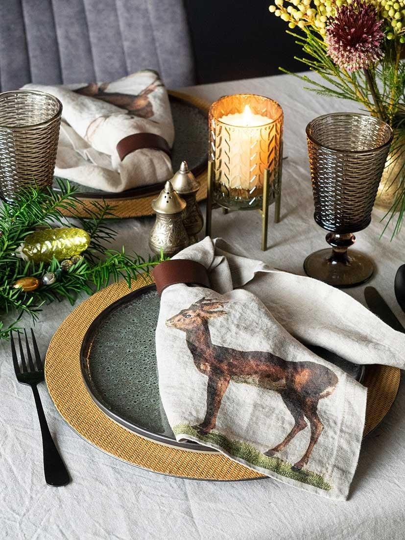 Picturesque Wild Animals linen napkins will bring a forest touch to your table. They will look great in country houses, mountain chalets or any dining rooms looking for countryside style. Ideal for Christmas! The brand�s uniqueness is that all six napkins of the set depict different forest animal which makes your table setting exciting and leaves guests surprised to have their personal serviette! Match with the Wild Animals tablecloth for a more impactful and festive feel! Our napkins are made from high-quality washed 100% European linen. You will enjoy pleasant fabric weight, generous size, mitred corners, hems of a nice proportion. Linen is a sustainable 100% plant-based fabric. Its cultivation and production are water-efficient, not polluting and residue-free, which is beneficial for nature and us! Linen is naturally hypoallergenic and safe for people having allergies or sensitive skin. 100% linen 45x45cm / 18x18 inch Set of 6