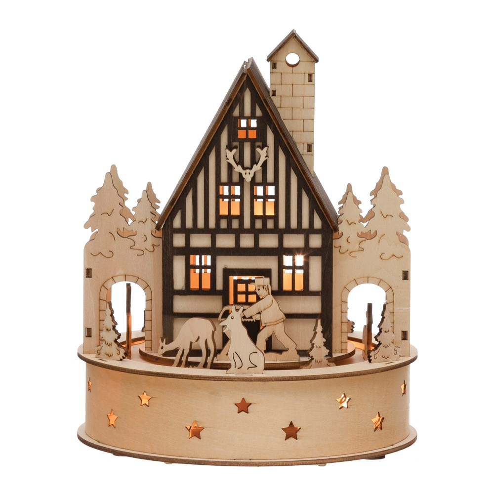 Wood Laser Cut Lodge w/ Rotating Deer & LED Light, Natural & Brown (Requires 3-AAA Batteries)