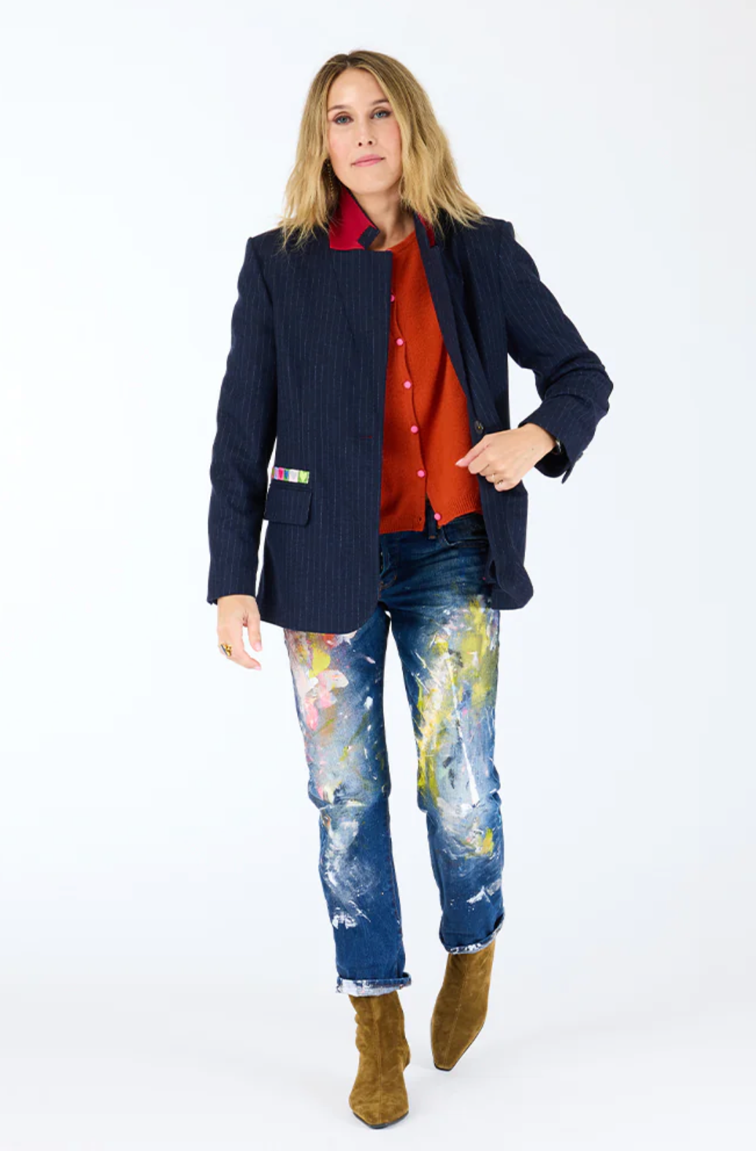 The Workday Love Brigade Blazer, in classic mens navy subtle pinstripe with Kerri's art details, making this one a show stopper. Love Brigade heart tapping on pockets and felting in unexpected colors under the collar, wear with you favorite jeans and your look is complete.