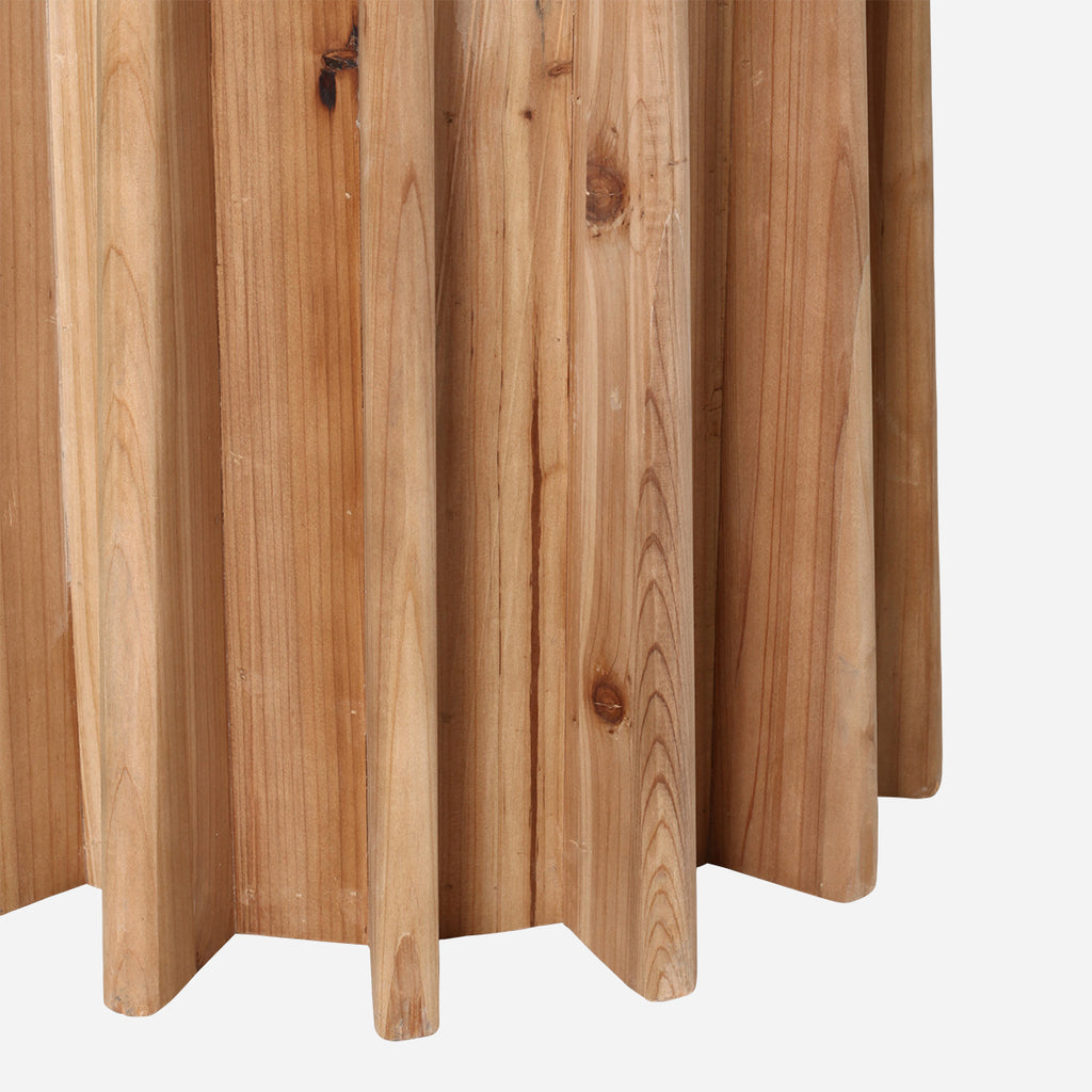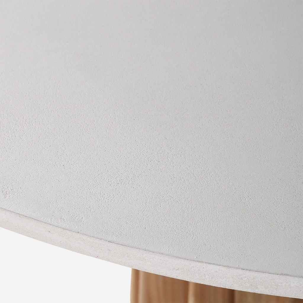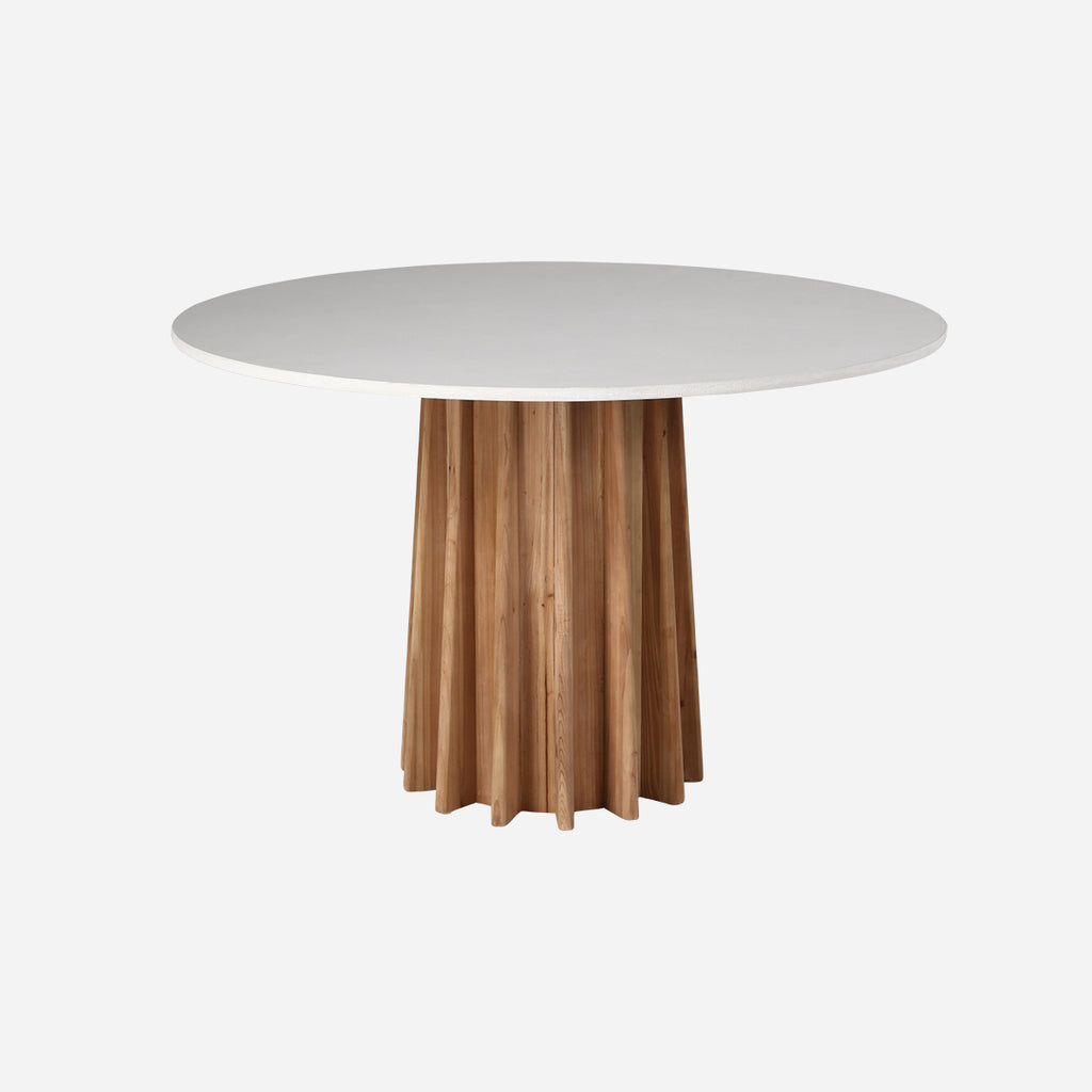 Large in stature, the Winnie Table is named for its crimped trunk base and overhanging tabletop. Finished in warm tones of natural brushed pine with an eggshell tabletop, the Willow Table has an illuminating effect for any foyer or dining space.